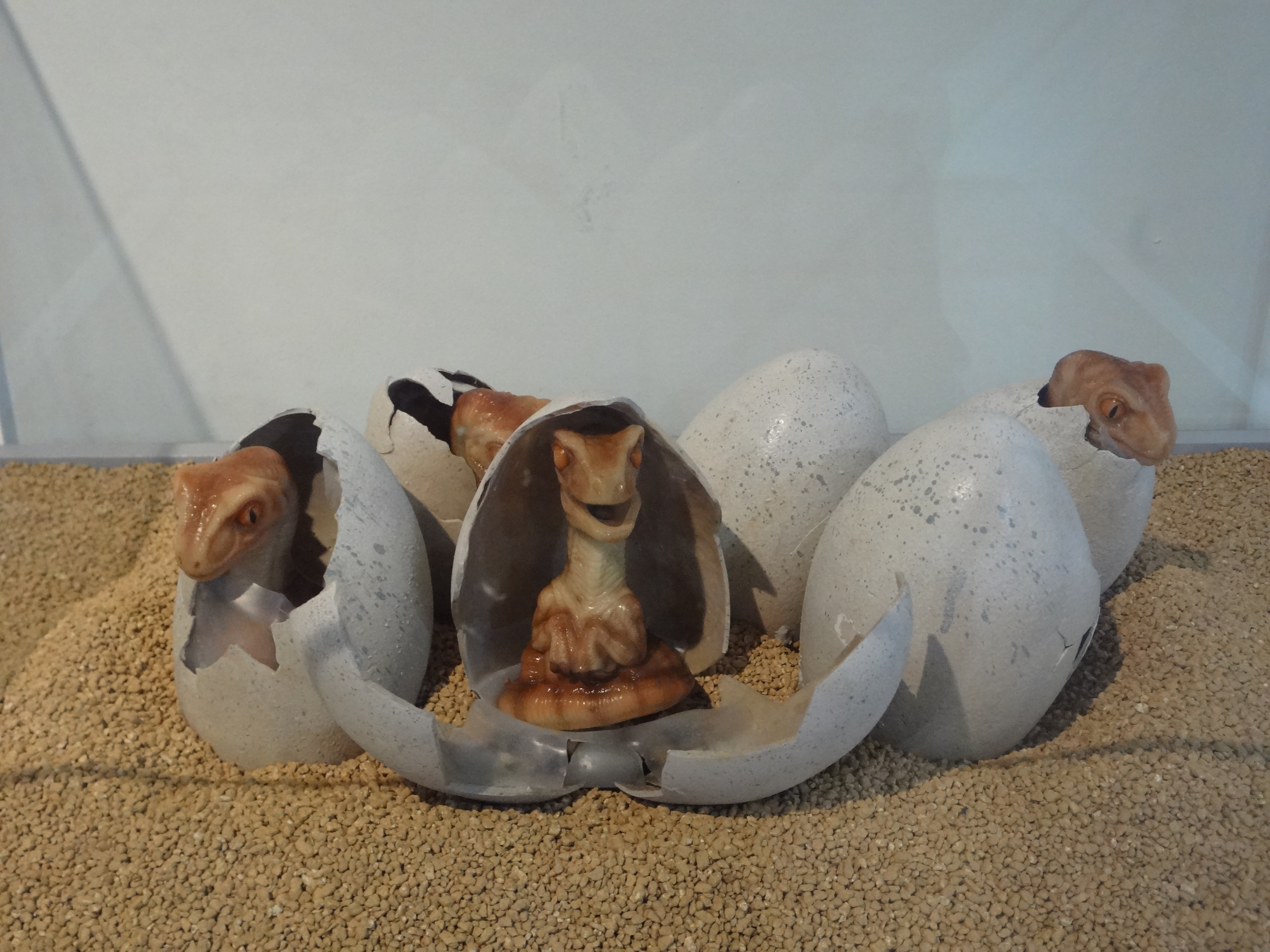 In the middle of a set of dinosaur eggs, one in the middle turned out to be mechanical and opened up to reveal a yawning dinosaur: