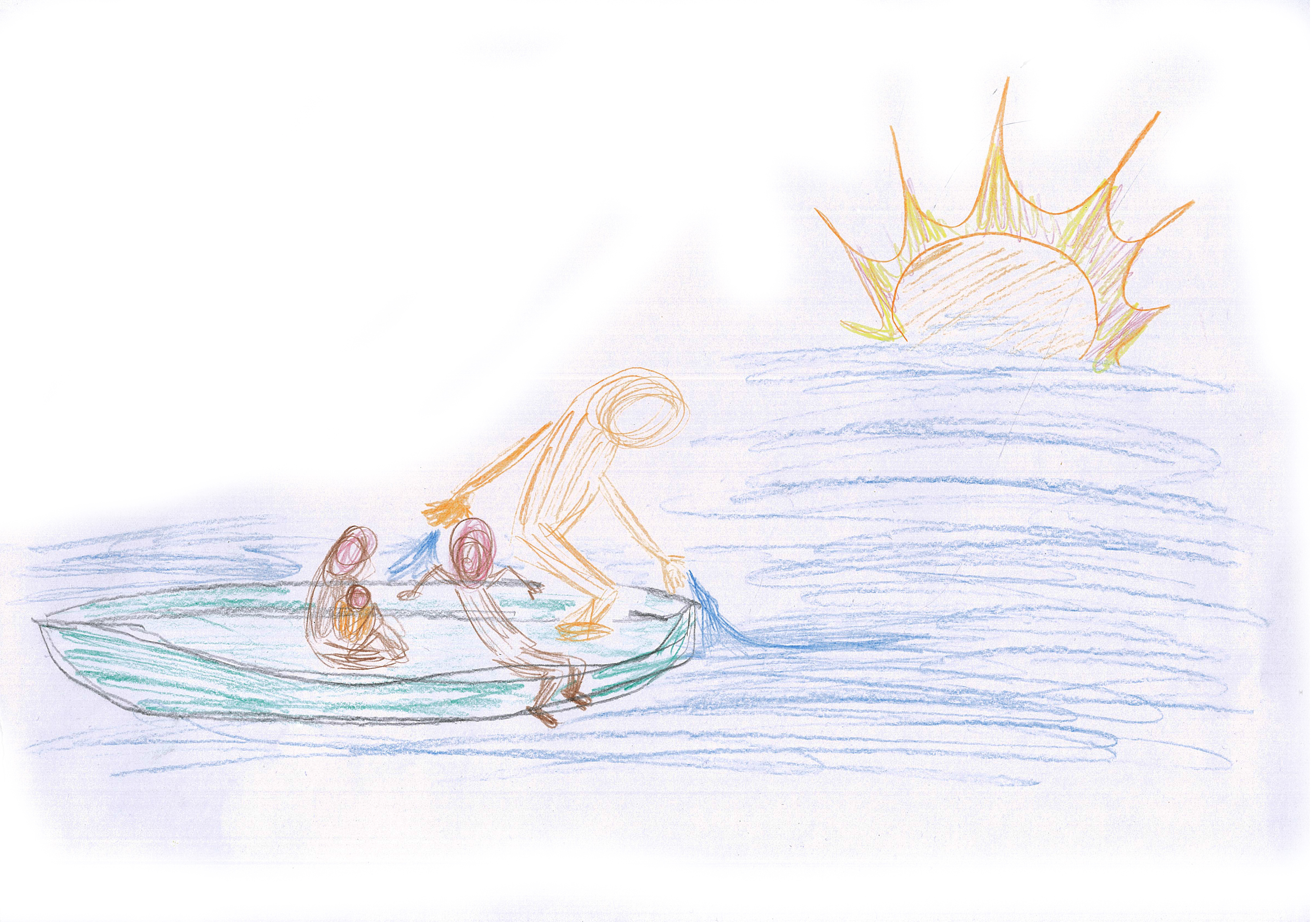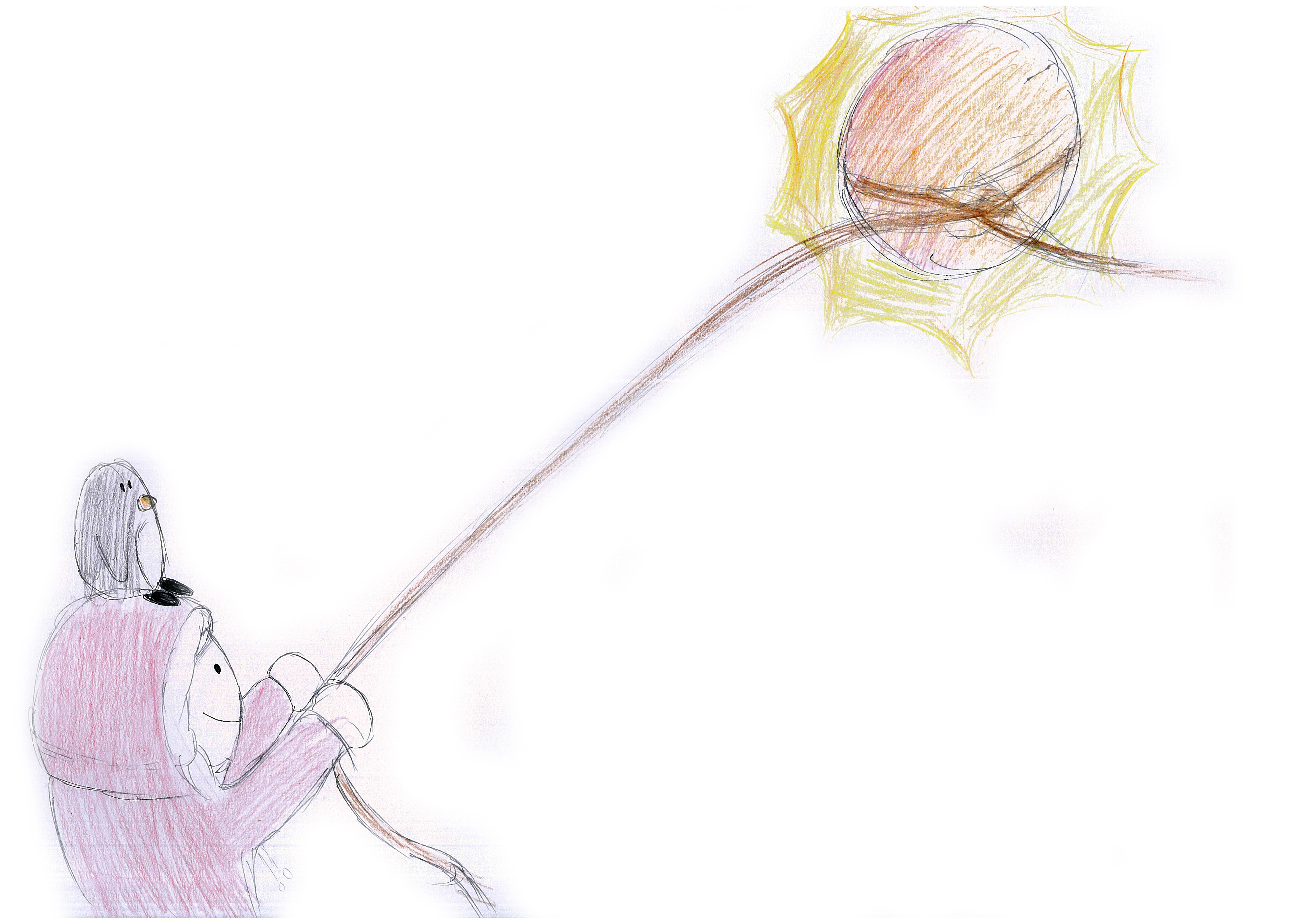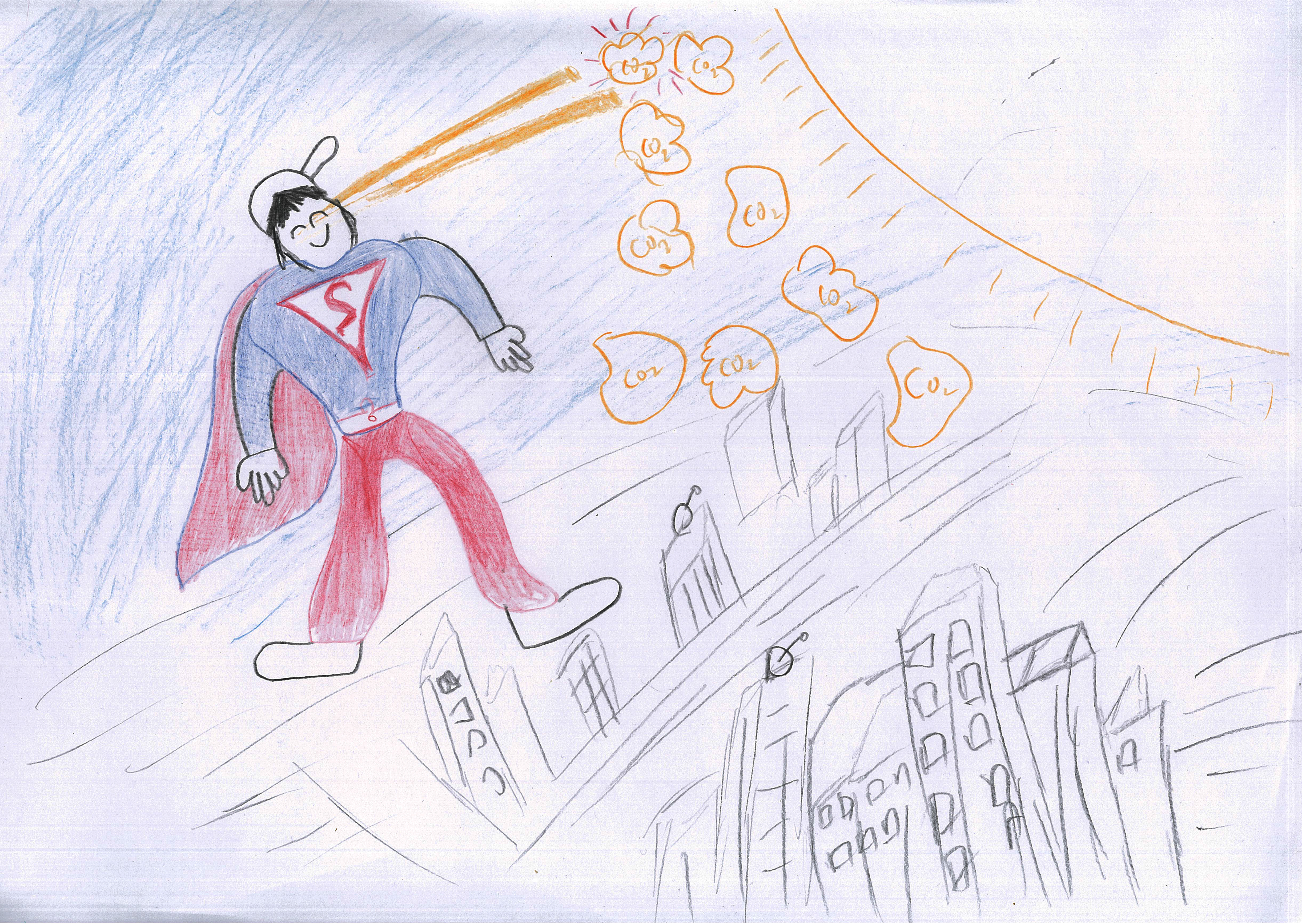 “This drawing shows a Superman shooting down CO2 gas molecules to reduce greenhouse warming. He is flying and protecting the atmosphere of the Earth.” —Chan Sze How
