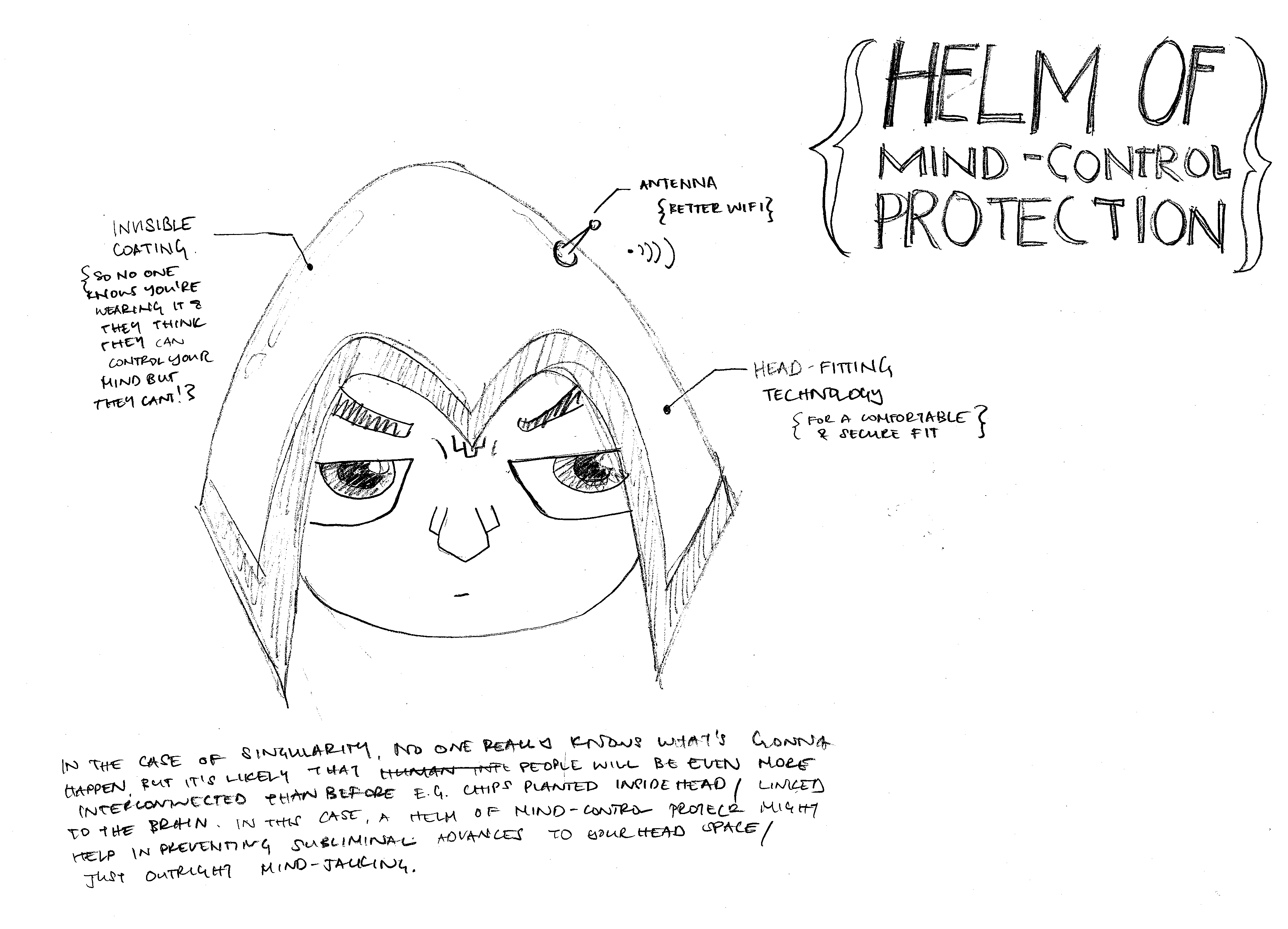 “In the case of singularity, no one really knows what’s gonna happen, but it’s likely that people will be even more interconnected than before. e.g. chips planted inside head / linked to the brain. In this case, a helm of mind-control protector might help in preventing subliminal advances to your head space / just outright mind-jacking.