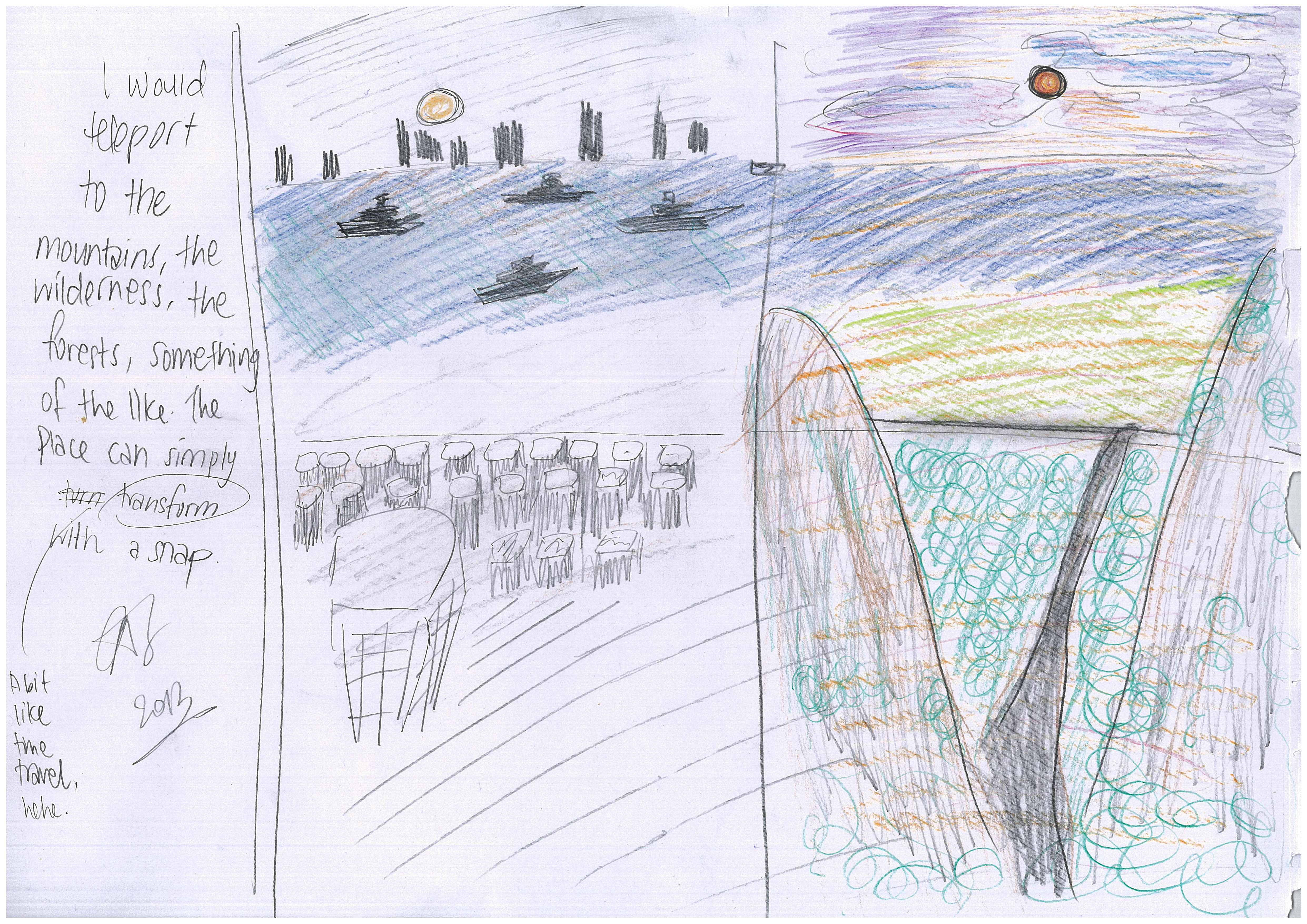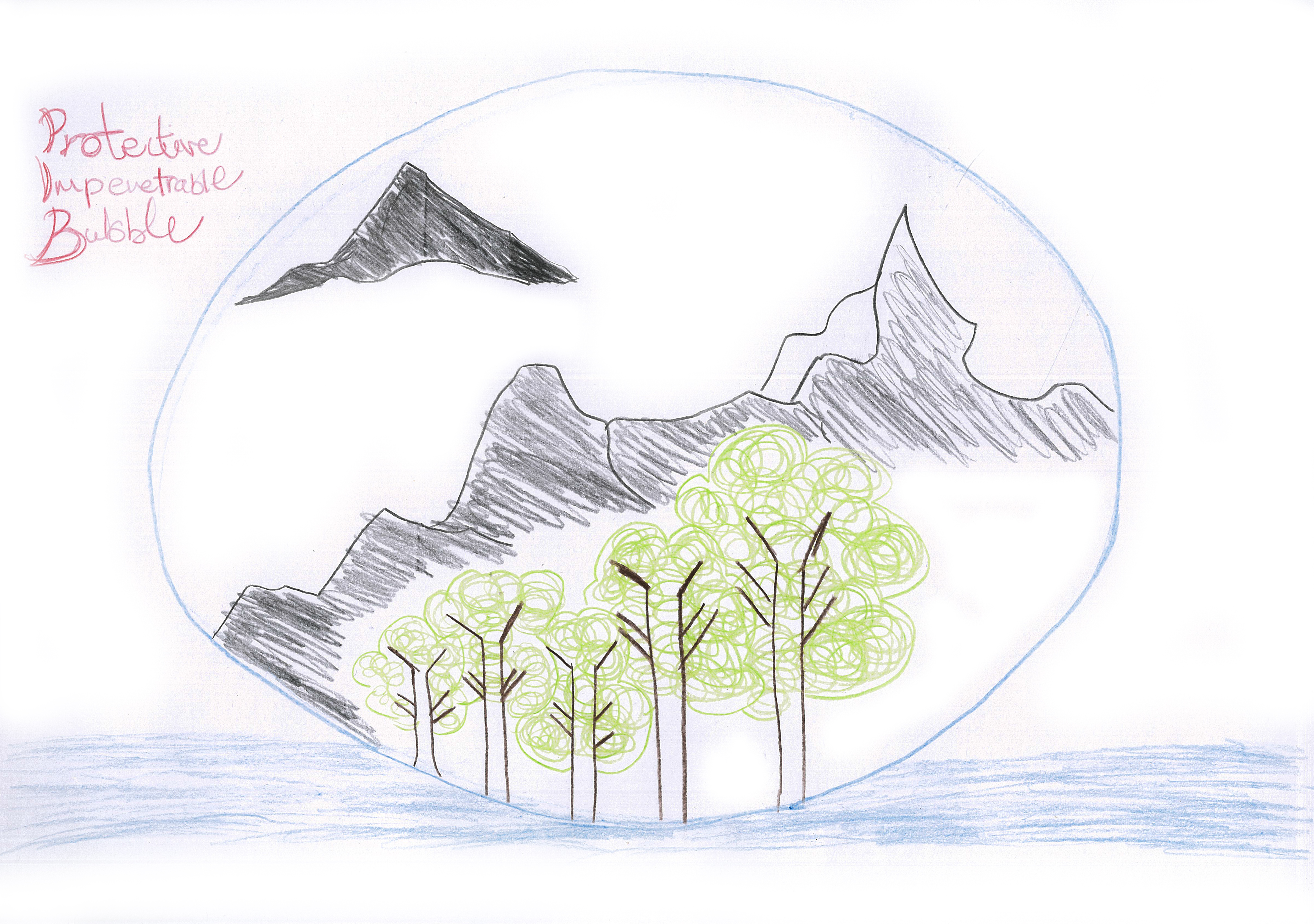 “An invisible sphere that can be activated with the click of a button. Being invisible, it will not block out the scenery but at the same time it can create a micro-climate in which people can control the temperature. It is like a force field that don’t need to be carried when you move.” —Lee Ying Lin