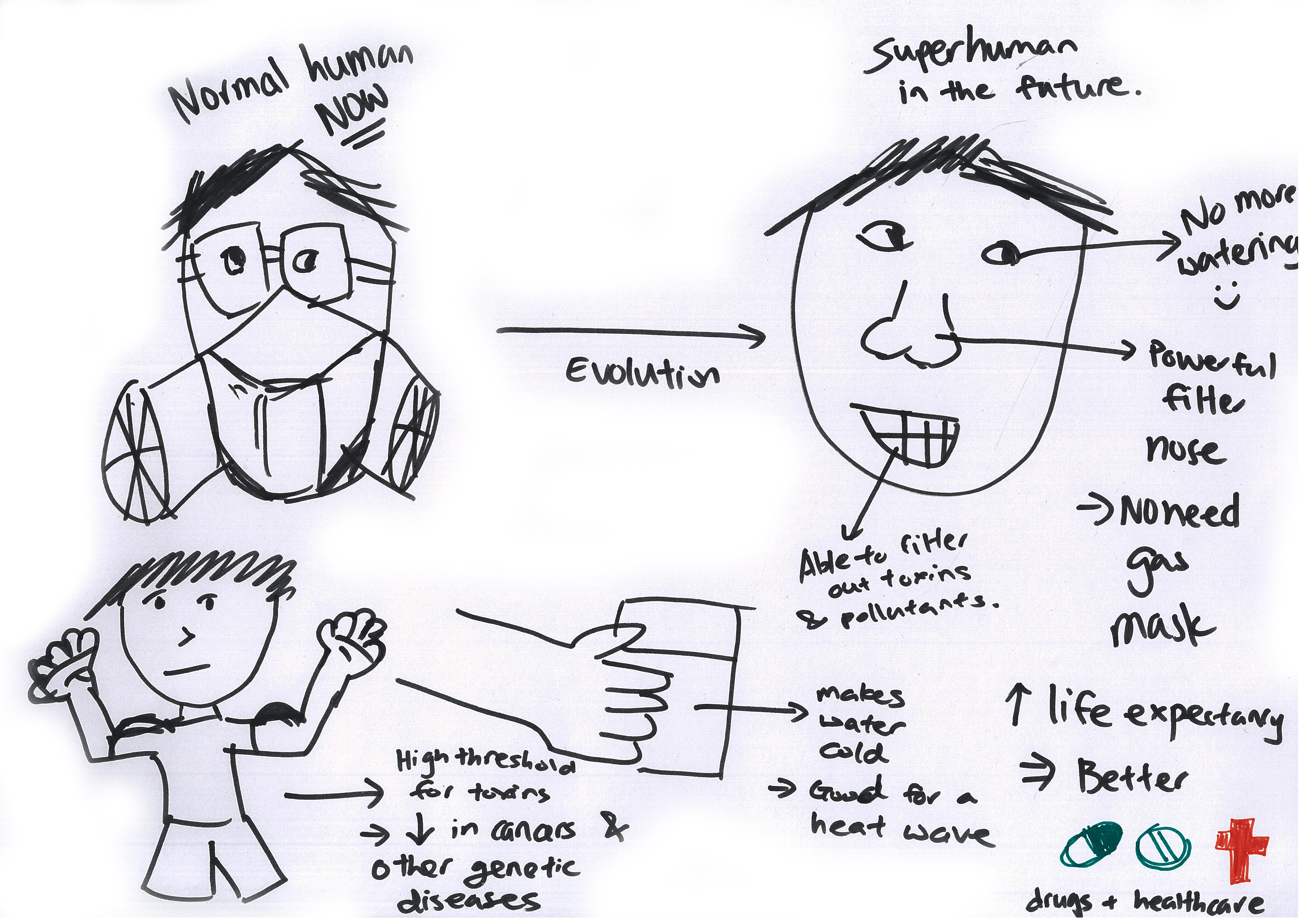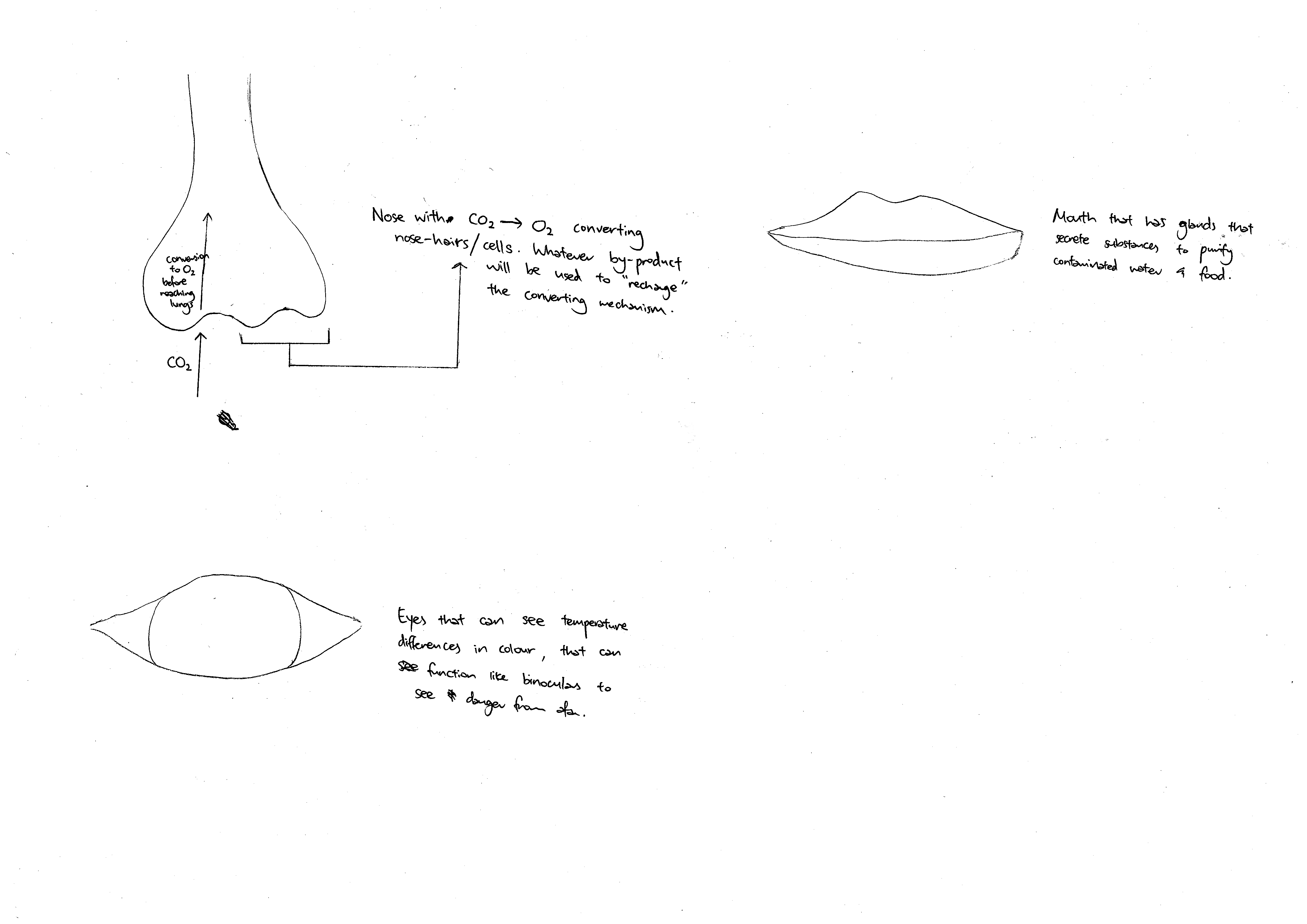 “Nose with CO2 to O2 converting nose-hair / cells. Whatever by-product will be used to “recharge” the converting mechanism. Eyes that can see temperature differences in color, that can function like binoculars to see danger from afar. Mouth that has glands that secrete substances to purify contaminated water and food.” —Cherlyn Tan