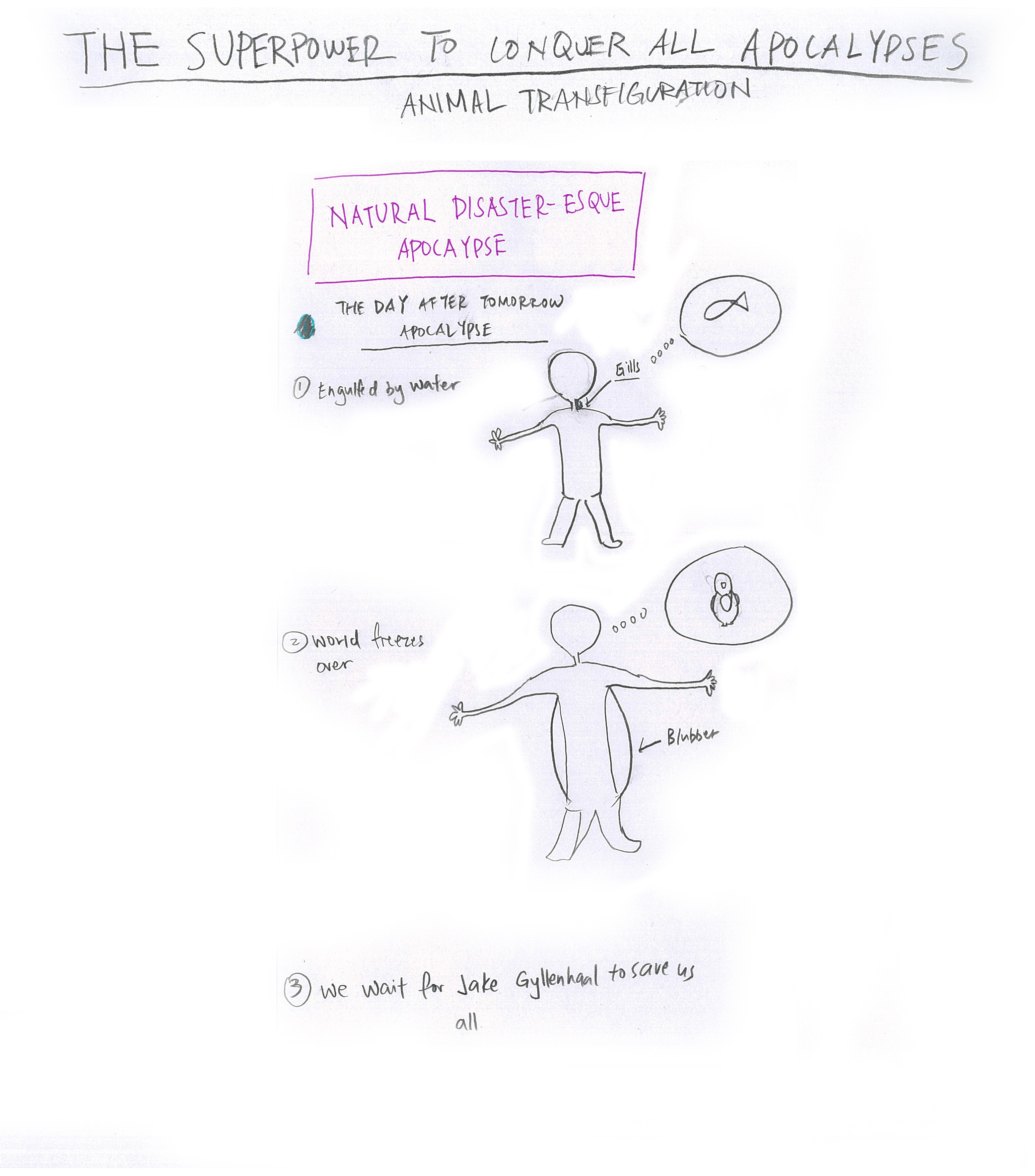 For the second part of The Apocalypse Workshop, I asked students to imagine their superpowers to navigate through the apocalypse they described in the beginning.