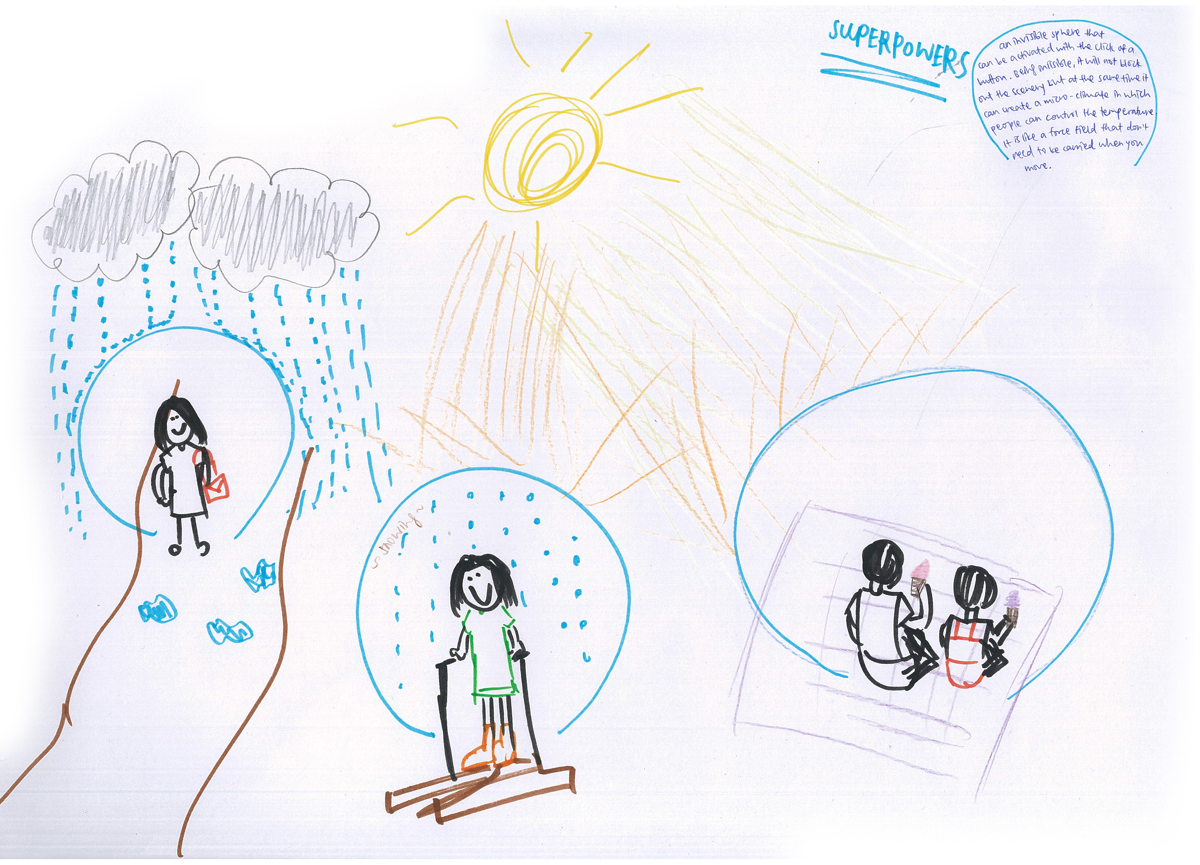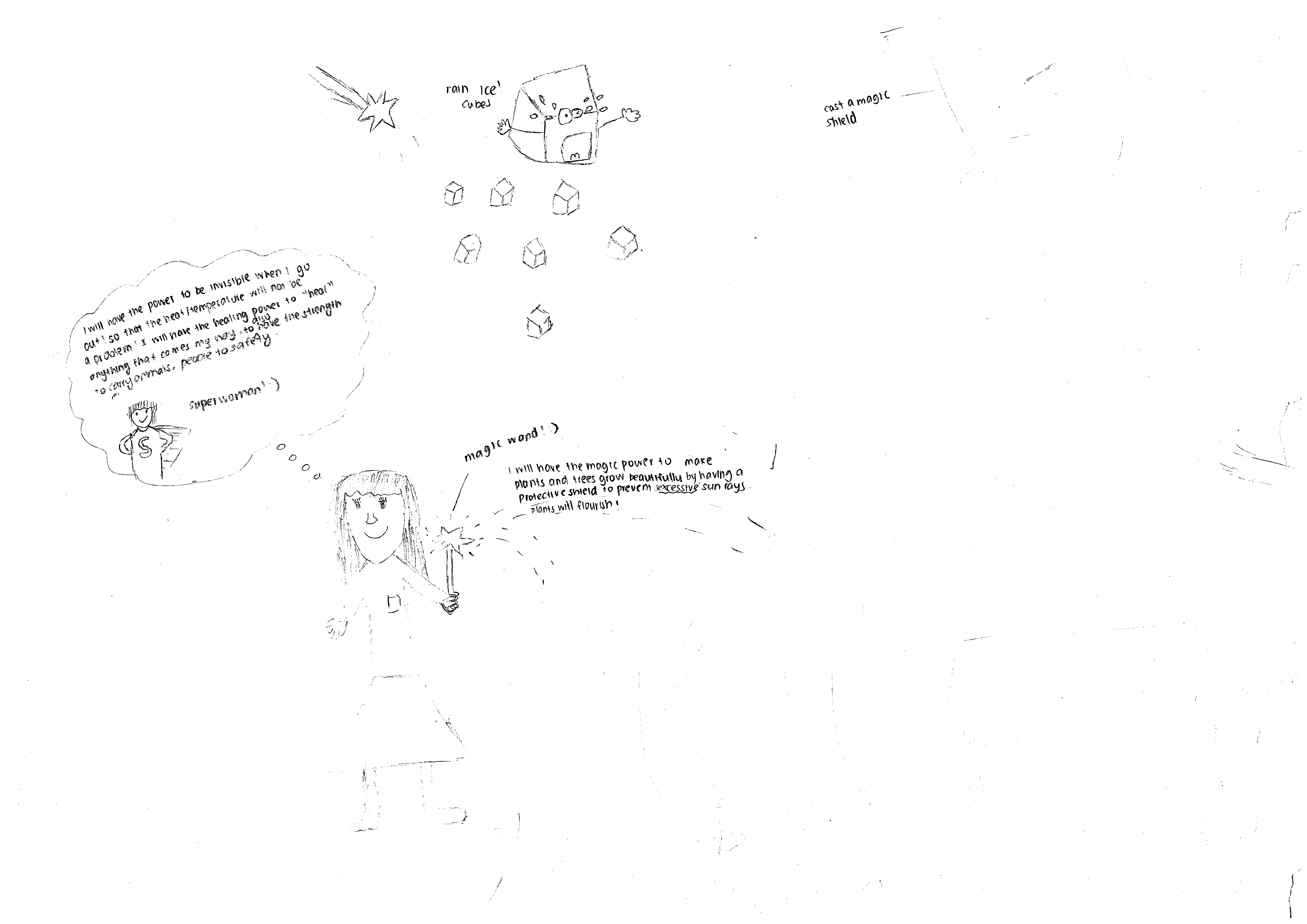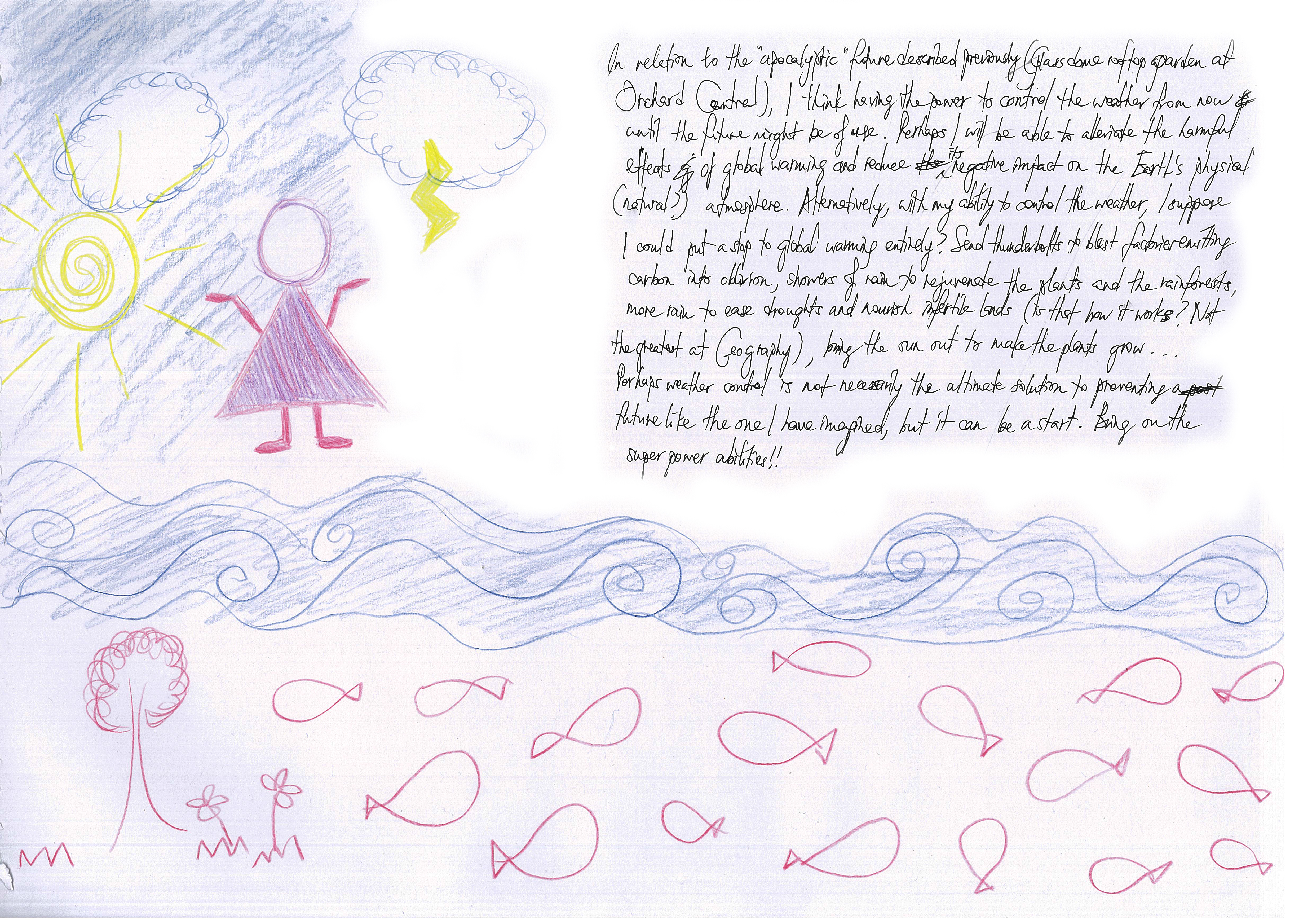 “…I think having the power to control the weather from now until the future might be of use. Perhaps I will be able to alleviate the harmful effects of global warming and reduce its negative impact on the Earth’s physical (natural?) atmosphere. Alternatively, with my ability to control the weather, I suppose I could put a stop to global warming entirely? Send thunderbolts to blast factories emitting carbon into oblivion, showers of rain to rejuvenate the plants and the rainforests, more rain to ease droughts and nourish infertile lands … bring the sun out to make the plants grow… Perhaps weather control is not necessarily the ultimate solution to preventing a future like the one I have imagined, but it can be a start. Bring on the superpower abilities!” —Rachel Lee