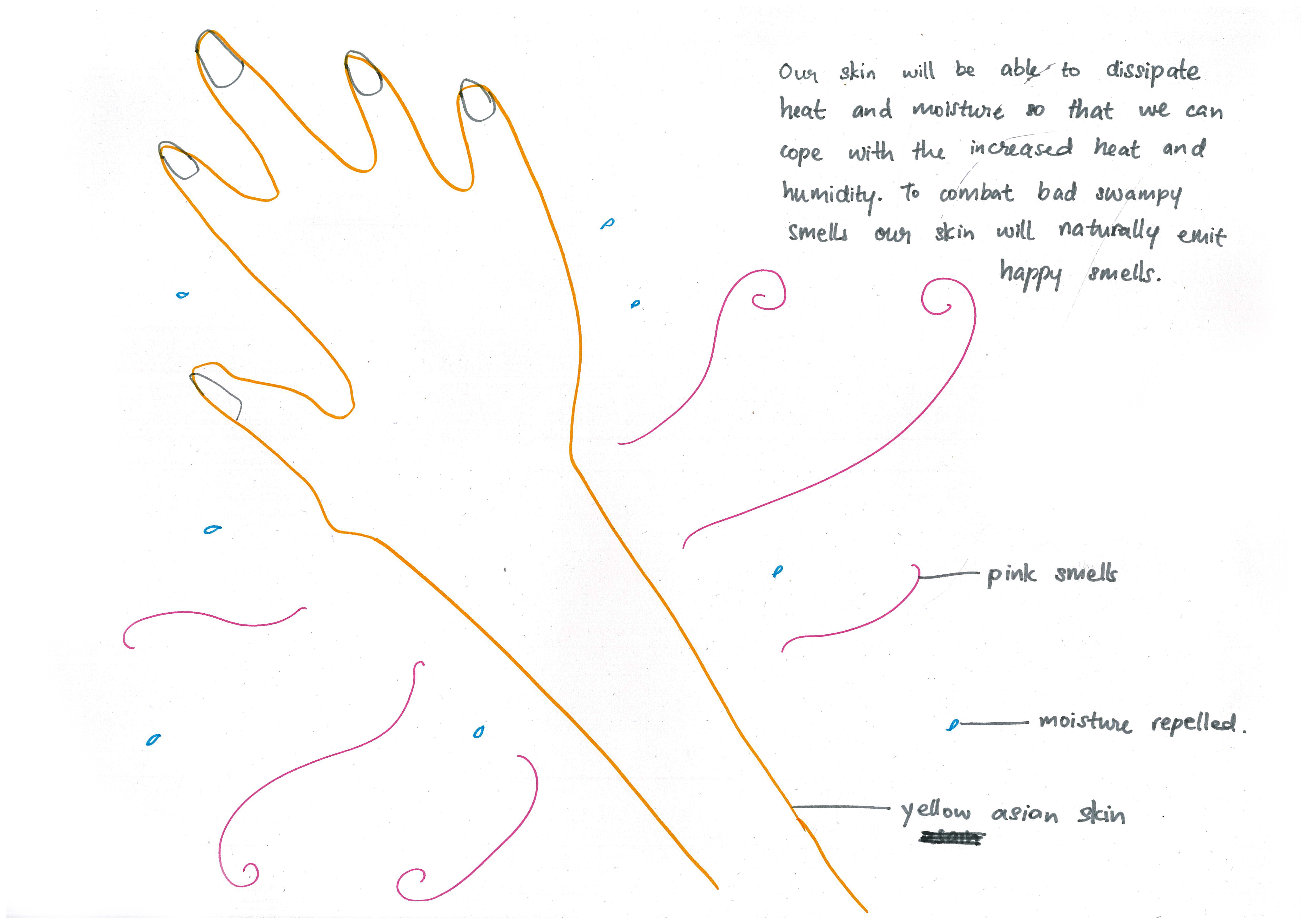 “Our skin will be able to dissipate heat and moisture so that we can cope with the increased heat and humidity. To combat bad swampy smells out skin will naturally emit happy smells.” —Jonathan T