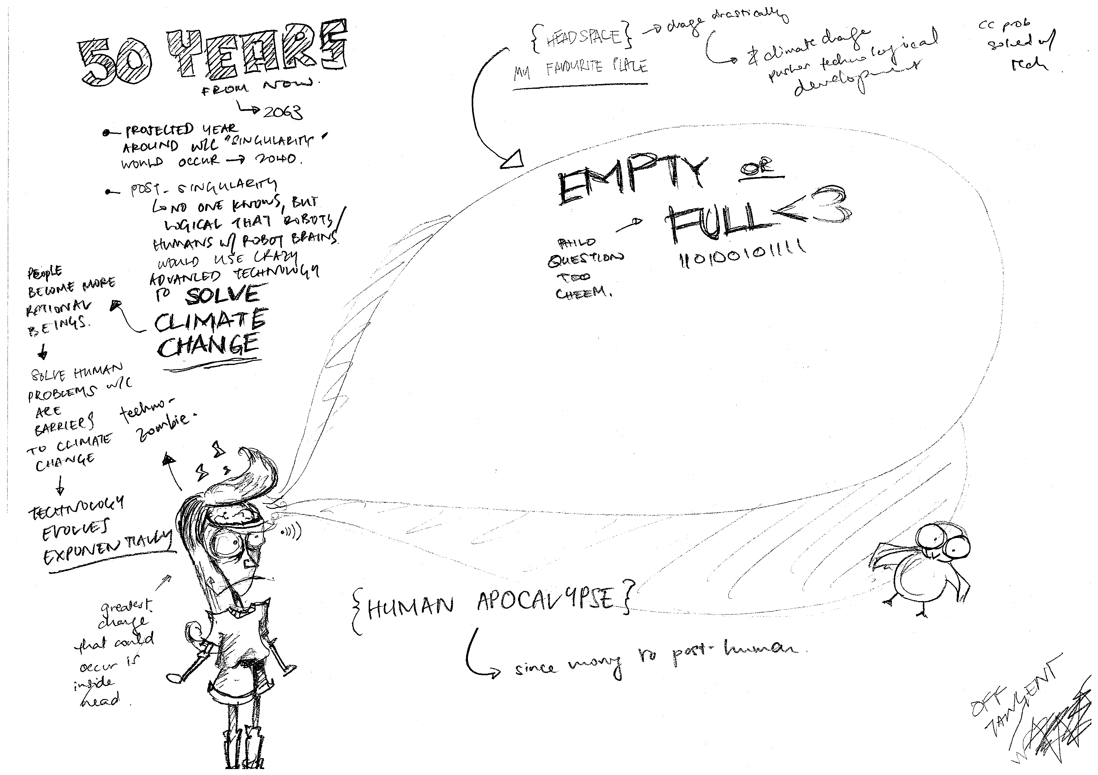 50 years from now > 2063 > Projected year around which “singularity” will occur: 2040 > Post-singularity: no one knows, but logical that robots / humans with robot brains would use crazy advanced technology to solve climate change > People become more rational beings > Solve human problems which are barriers to climate change > Technology evolves exponentially