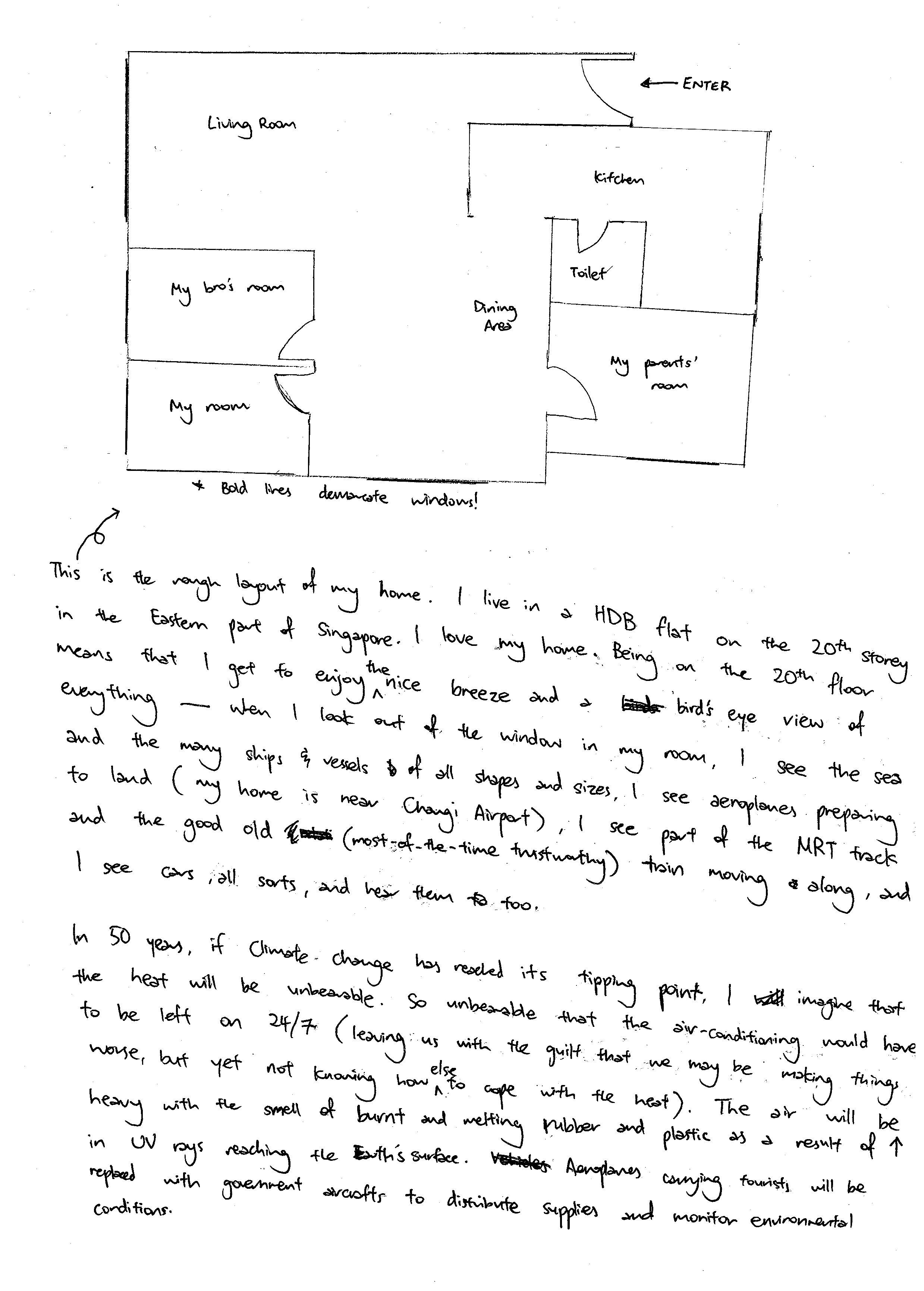 This is the rough layout of my home. I live in a HDB flat on the 20th storey in the Eastern part of Singapore. I love my home. Being on the 20th floor means that I get to enjoy the nice breeze and a bird’s eye view of everything—when I look out of the window in my room, I see the sea and the many ships and vessels of all shapes and sizes. I see aeroplanes preparing to land (my home is near Changi Airport), I see part of the MRT track and the good old (most-of-the-time trustworthy) train moving along, and I see cars, all sorts, and hear them, too.