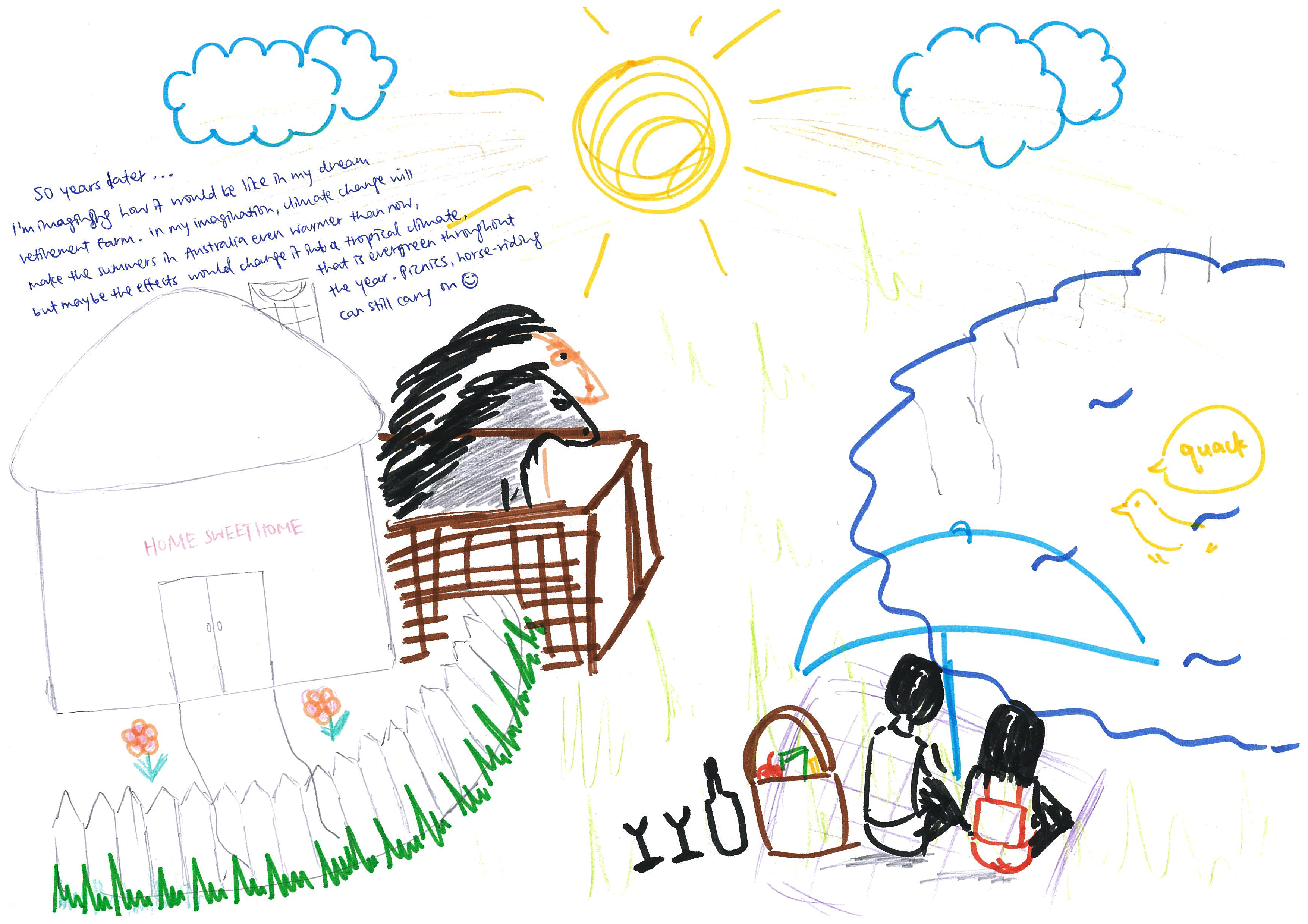 50 years later… I’m imagining how it would be like in my dream retirement farm. In my imagination, climate change will make the summers in Australia even warmer than now, but maybe the effects would change it into a tropical climate, that is evergreen throughout the year. Picnics, horse-riding can still carry on.