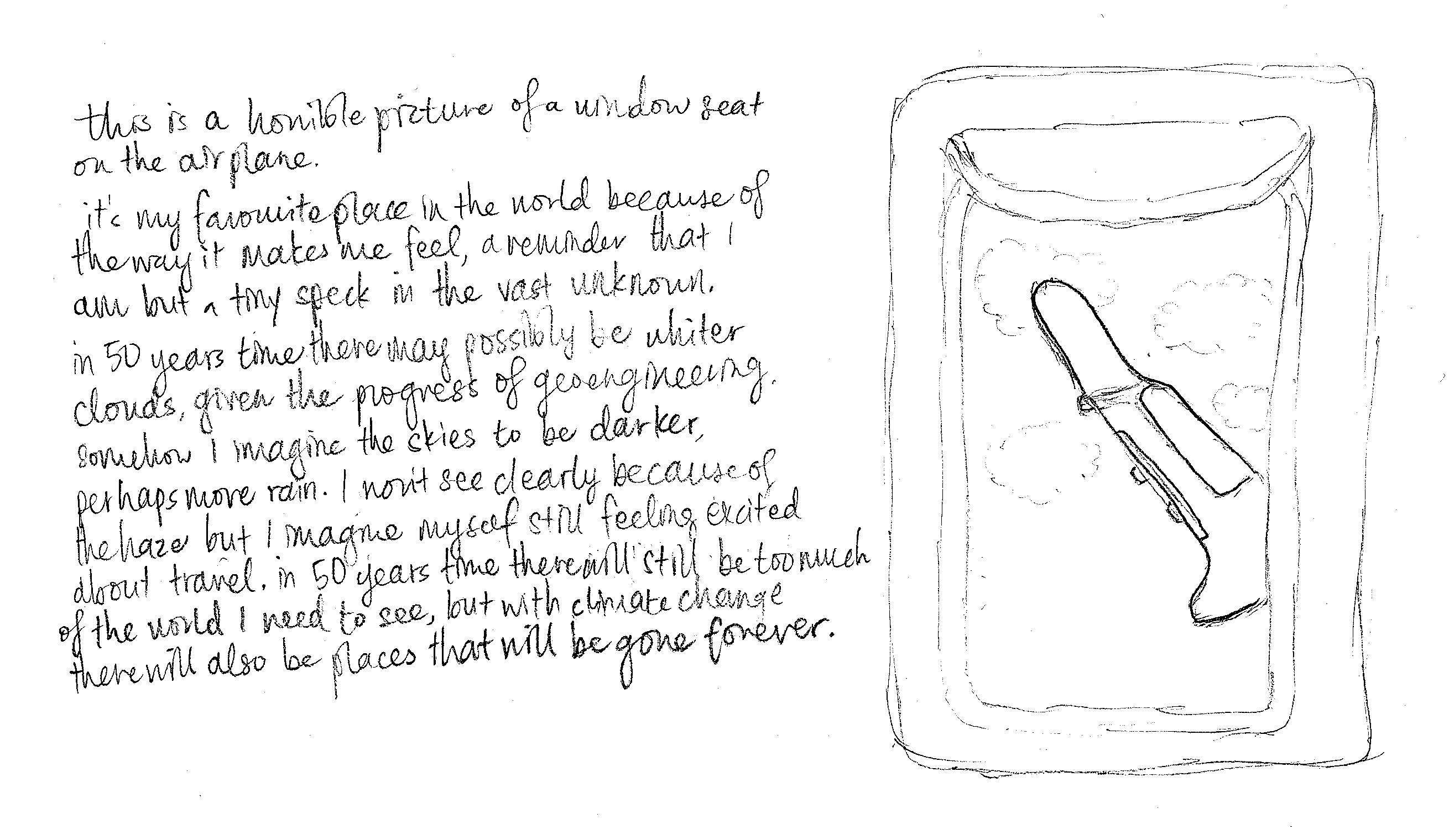 This is a horrible picture of a window seat on the airplane. It’s my favourite place in the world because of the way it makes me feel, a reminder that I am but a tiny speck in the vast unknown. In 50 years’ time there may possibly be whiter clouds, given the progress of geoengineering. Somehow, I imagine the skies to be darker, perhaps more rain. I won’t see clearly because of the haze but I imagine myself still feeling excited about travel. In 50 years’ time there will still be too much of the world I need to see, but with climate change there will also be places that will be gone forever.