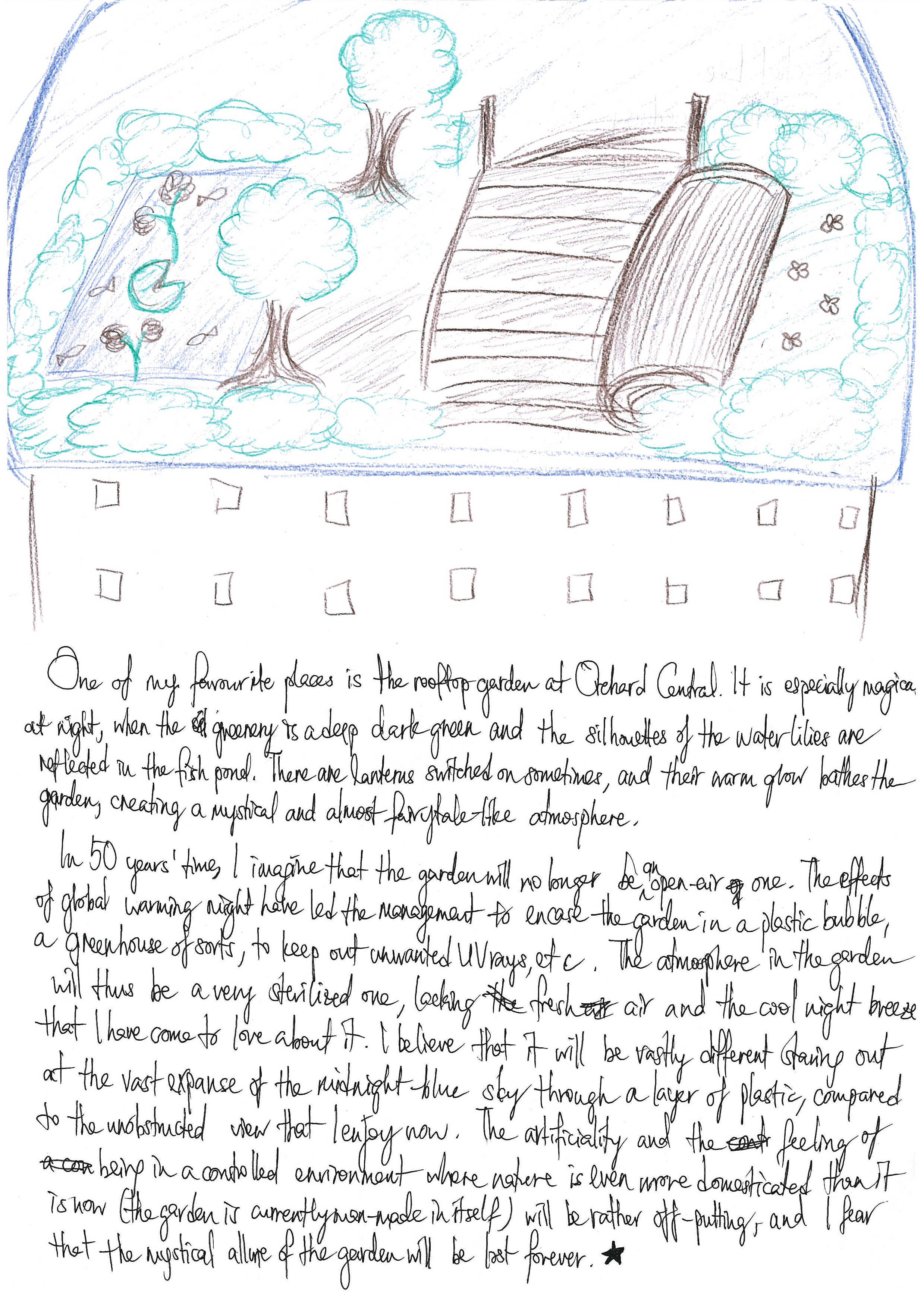 In 50 year’s time, I imagine that the garden will no longer be an open-air one. The effects of global warming might have led the management to encase the garden in a plastic bubble, a greenhouse of sorts, to keep out unwanted UV rays, etc. The atmosphere in the garden will thus be a very sterilized one, lacking fresh air and the cool night breeze that I have come to love about it. I believe that it will be vastly different staring out at the vast expanse of the midnight-blue sky through a layer of plastic, compared to the unobstructed view that I enjoy now. The artificiality and the feeling of being in a controlled environment where nature is even more domesticated than it is now (the garden is currently man0made in itself) will be rather off-putting, and I fear that the mystical allure of the garden will be lost forever.