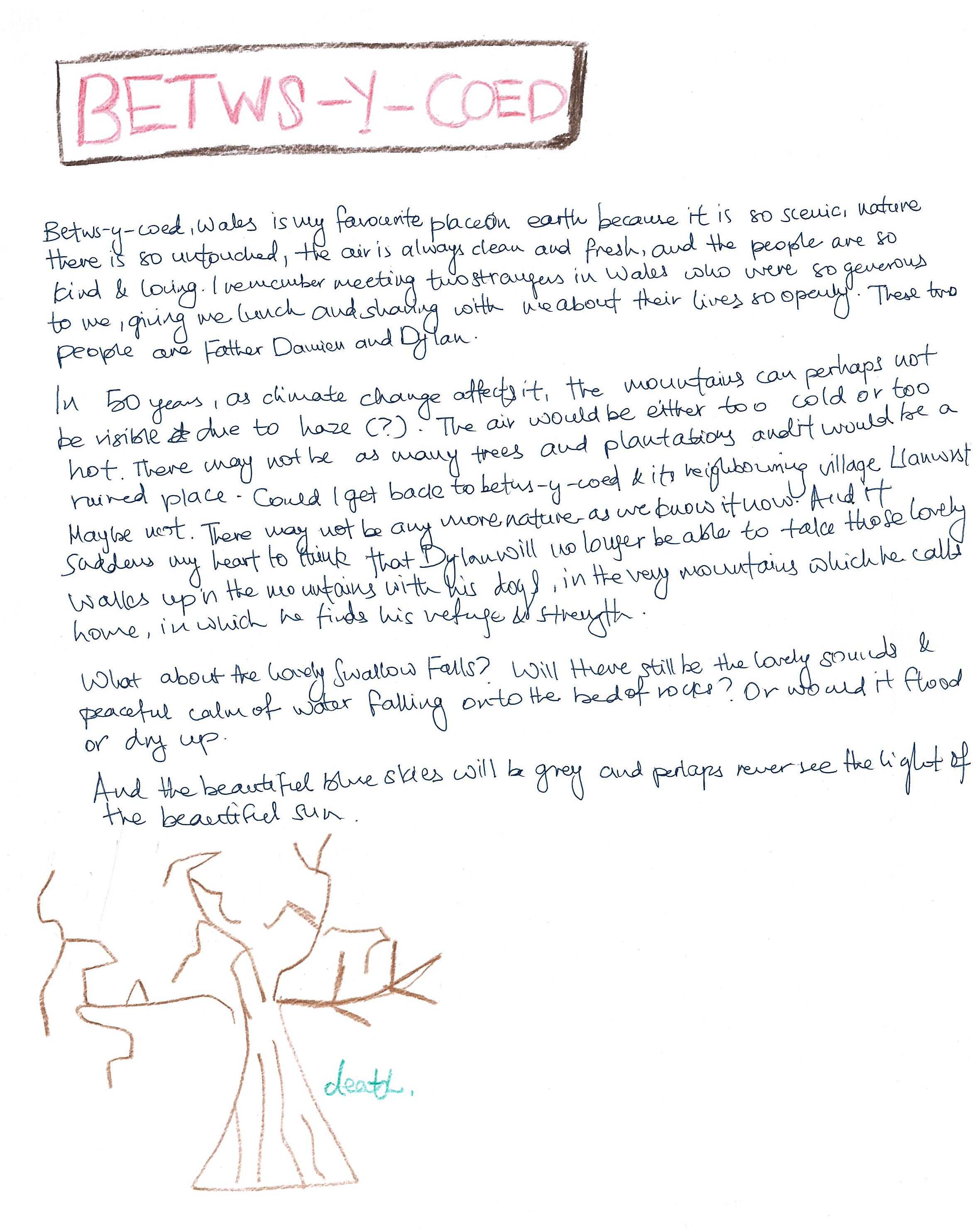 In 50 years, as climate change affects it, the mountains can perhaps not be visible due to haze. The air would be either too cold or too hot. There may not as as many trees and plantations and it would be a ruined place. Could I get back to Betws-y-Coed and it’s neighboring village Llanrwst? Maybe not. There may not be any more nature as we know it now! And it saddens my heart to think that Dylan will no longer be able to take those lovely walks up in the mountains with his dogs, in the very mountains which he calls home, in which is finds his refuge and strength.