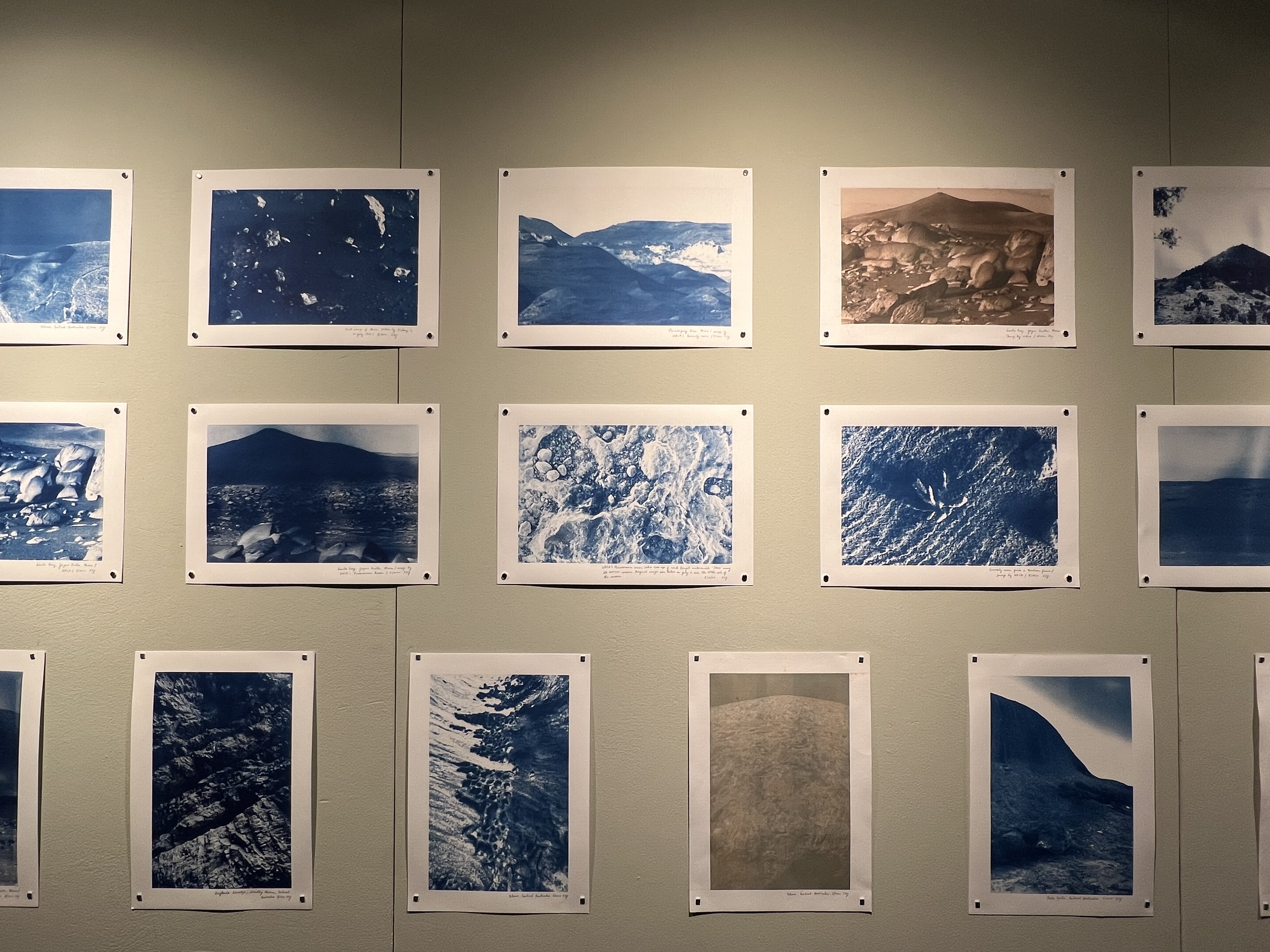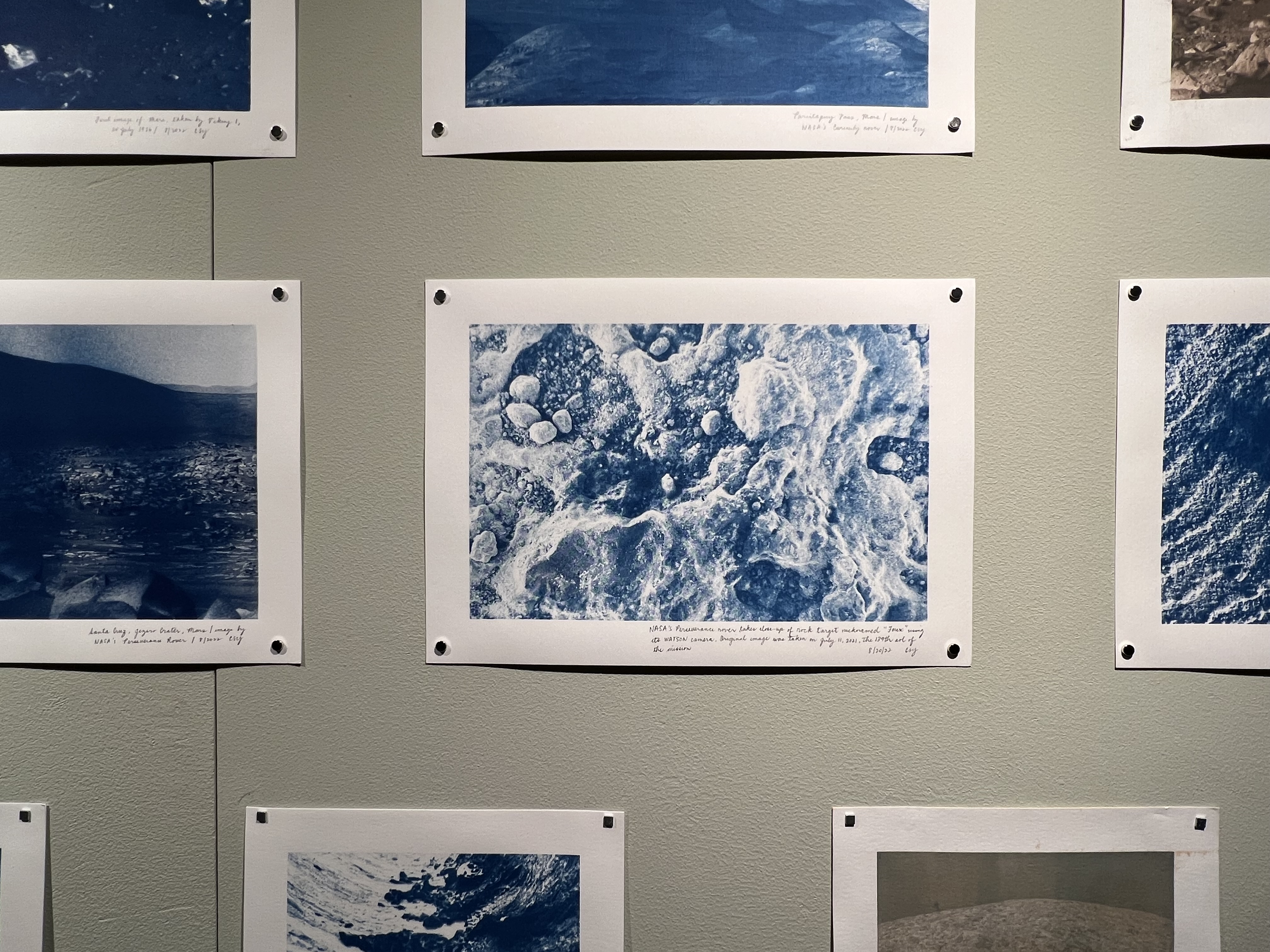 Earth/Mars, was exhibited at the Haus der Kulturen der Welt for #Commonings, the final edition of The New Alphabet. In this art installation, cyanotypes of the deserts of Central Australia are juxtaposed with those of open-source Mars images by the National Aeronautics and Space Administration. These images, normally a deep Prussian blue, are toned with various experimental botanical inks. Side by side, these dry landscapes, both contested lands, may function as a good starting point to think through existing settler-colonial violence and regimes on Earth such as with Palestine, the Philippines and many others. The challenges of getting to space in human history went from an international space race to a more individualized one by billionaires, increasing discourse on inequality and catastrophe on Earth. Thinking of Planet B may help to clarify the intentions and goals with Planet A. Can the collective challenges faced on Mars lead people to find or seek out common ground that has been missing on Earth?