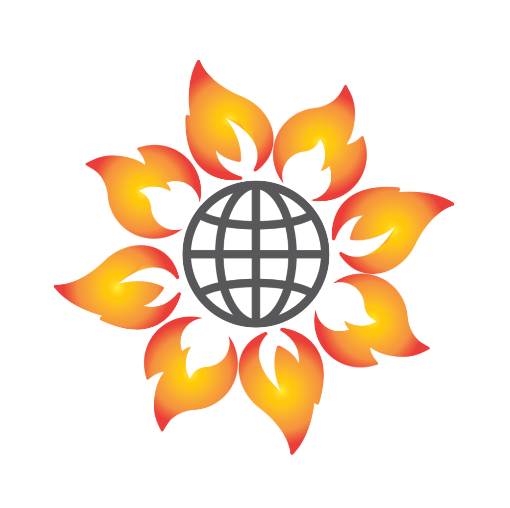 After much back and forth with Liang, we resisted the tight, more symmetric design on the left and decided for the final design on the right. A looser, shabbier ‘sunflower’ is a better fit for a design for activists, who work to subvert the rigid, oppressive systems we have today. Note that the fire ‘petals’ don’t actually touch the planet—symbolic of how climate activists worldwide are fighting for climate action to prevent more destructive wildfires and other climate impacts.
