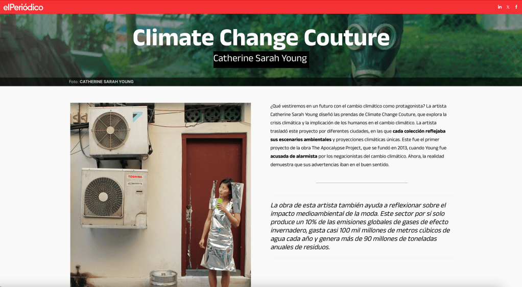 One of my projects is on this list of artists working on the climate crisis in El Periódico, a daily newspaper based in Barcelona, Spain. ‘Climate Change Couture’ was a series I started in Singapore in 2013, collaborating with sustainability researchers as an artist-in-residence at Singapore-ETH Centre to co-create garments we might wear under various climate futures. I’m honoured to be on a list of artists I admire, such as Olafur Eliasson (I cited his and Minik Rosing’s work, ‘Ice Watch’, in my PhD), Ai Weiwei, and others. Most importantly, I consider this a full circle moment, because back when I used to live in Barcelona for art school, I would read El Periódico to improve my Spanish. Reading this today made me smile — because I understood the text. Gracias!