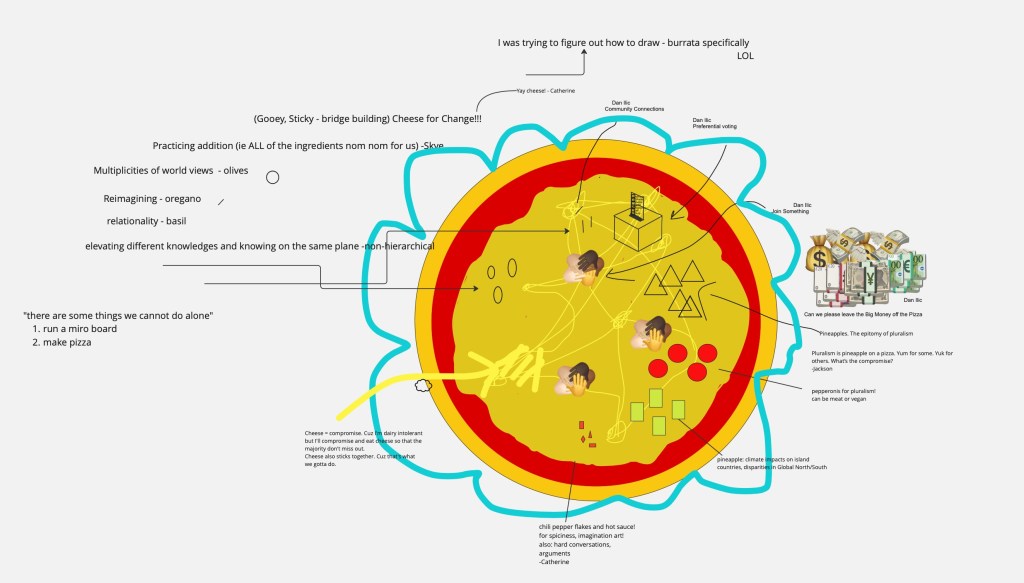 Using a Miro board, we collaborated on the pizza. The pizza toppings reflect what we think pluralism is: