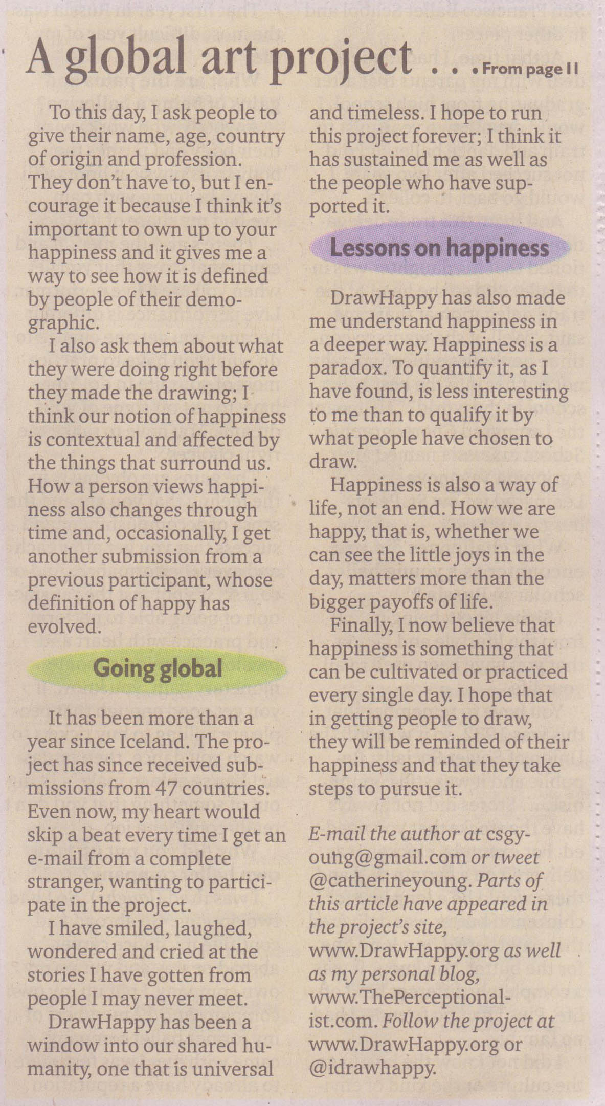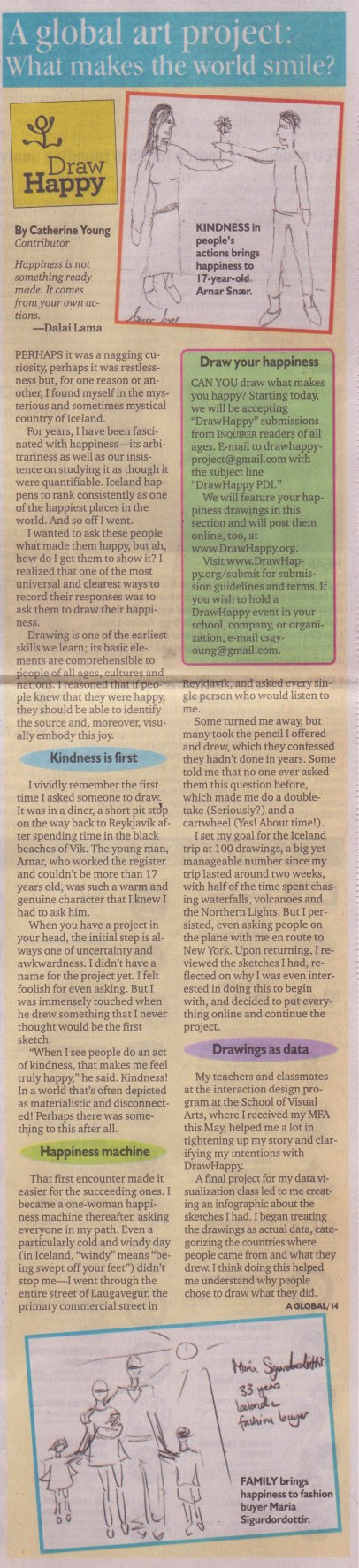 Young, Catherine. “A global art project: What makes the world smile?” Philippine Daily Inquirer, Learning section, page H4, 26 July 2012.