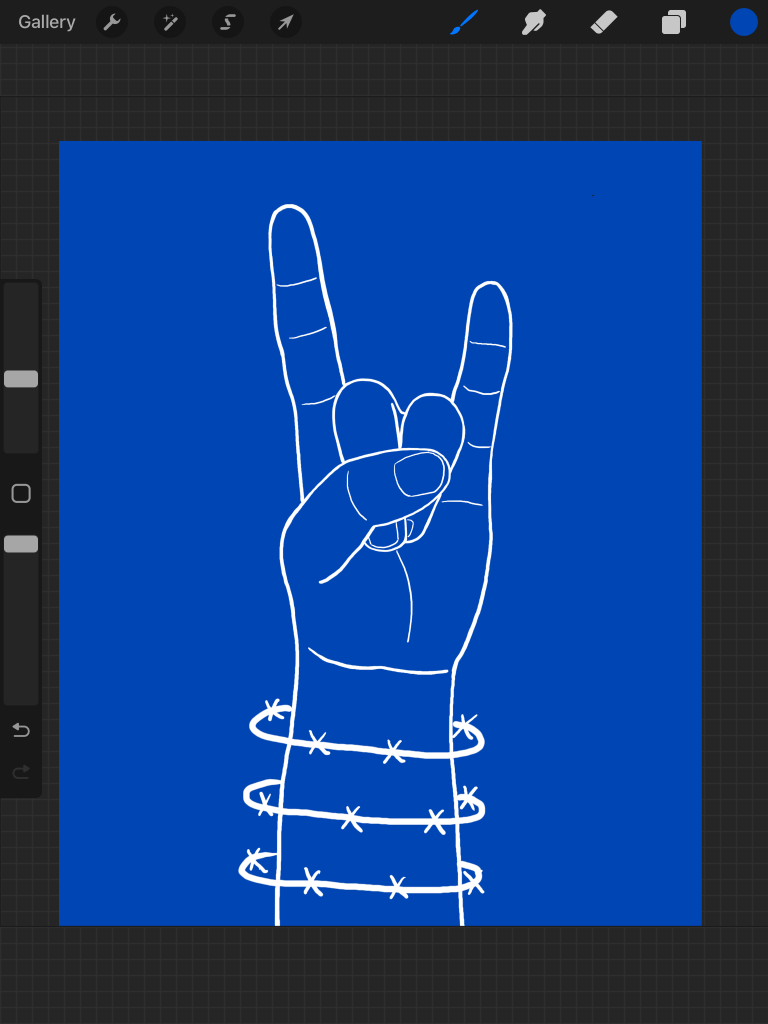 I thought of Jesús going to rock concerts with his friends and imagined his hand sticking out with this gesture wrapped in paper wristbands typical of concerts and festivals, and substituted this with barbed wire as a symbol of his activism.