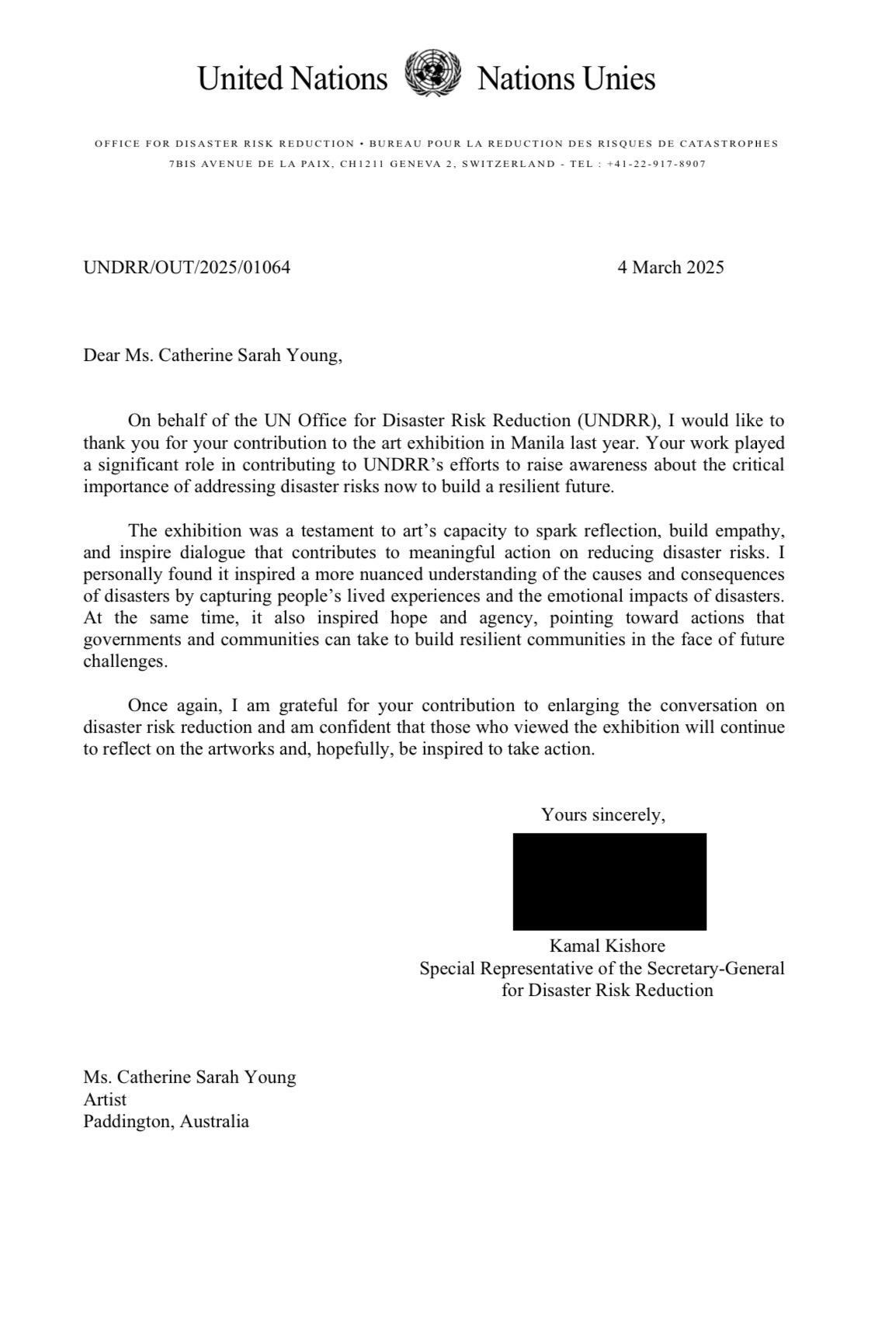 Thank you, UN, for the kind words and for the opportunity to contribute to last year’s exhibition, “Are You Ready?” I’m grateful to use art as a way to engage with global conversations and help us steer our planet to a better path for all.