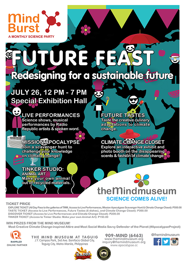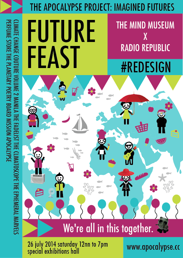 Hello, apocalypters! I’m excited to announce that as a culminating event for The Apocalypse Project: Imagined Futures, The Mind Museum is collaborating with Radio Republic to bring you Future Feast, a celebration of human creativity and our hopes for a sustainable future. The event will be on July 26, Saturday, 12PM to 7PM at the Special Exhibition Hall of The Mind Museum.