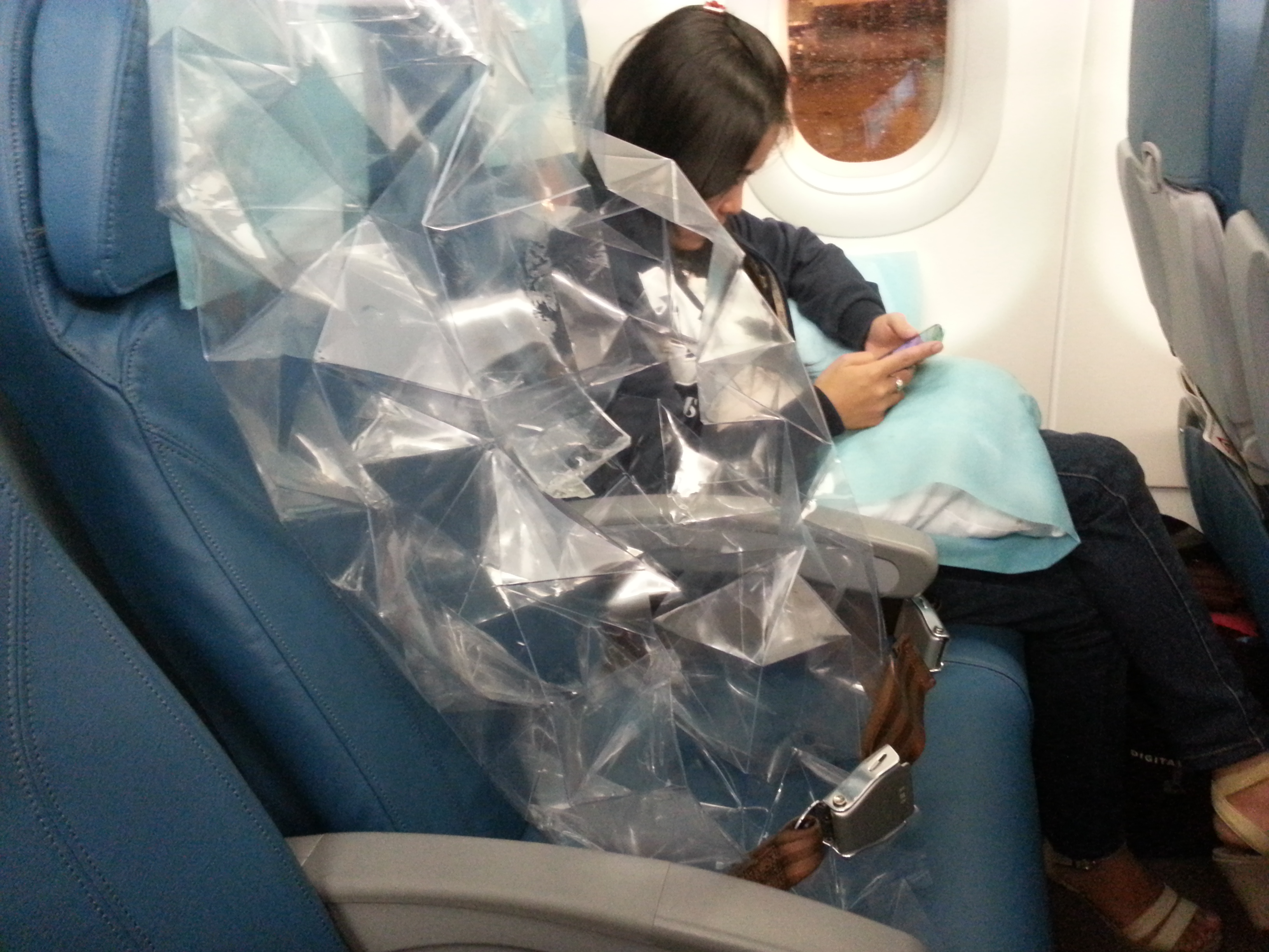Philippine Airlines Flight No. PR 512 had a strange guest buckled up on Seat No. 73B. My sentimental side insisted on bringing The Bubble prototype for Climate Change Couture. It got through so many things already—a gallery show, a photo shoot, was co-designed by someone on my Apocalypse Squad, and has been the starter for many a conversation that I didn’t care about the bulkiness of it. I was going to drag this $2 piece of plastic across international barriers if it killed me.