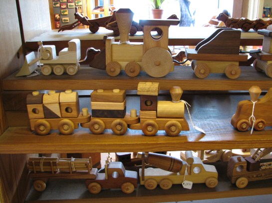 The store carries works by several artists, and while I loved the trains, the puzzle boxes, and the animals on wheels, what made me so incredibly happy were these three-dimensional interlocking wooden animal puzzles by Peter Chapman.