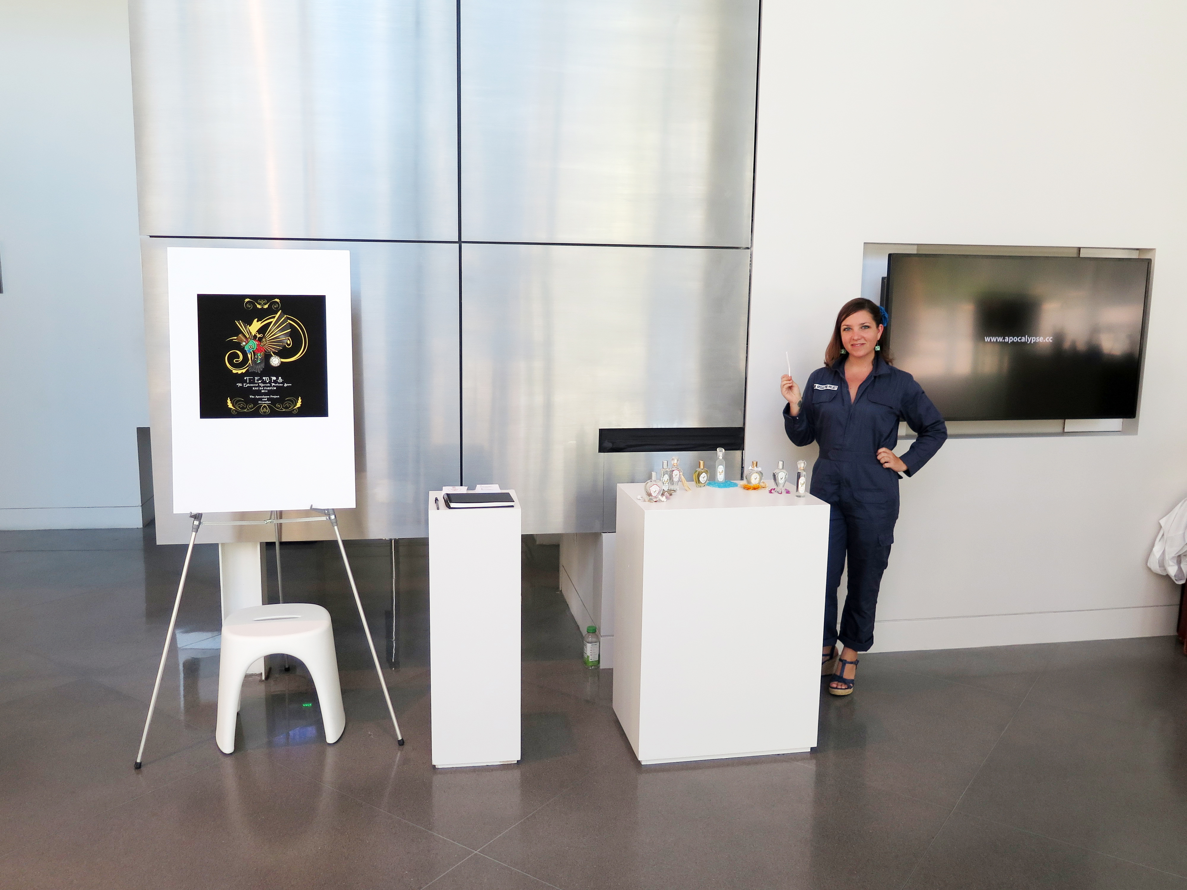 Here are some photos from The Ephemeral Marvels Perfume Store’s exhibit at the Open City / Art City Festival last October 4, co-organized the Institute for the Future and Yerba Buena Center for the Arts. Many thanks and huge congratulations to my friend Zoe Bezpalko (who also modeled one of the Climate Change Couture garments last year and is shown in the above photo wearing an Apocalypse Suit), for handling this single-handedly.
