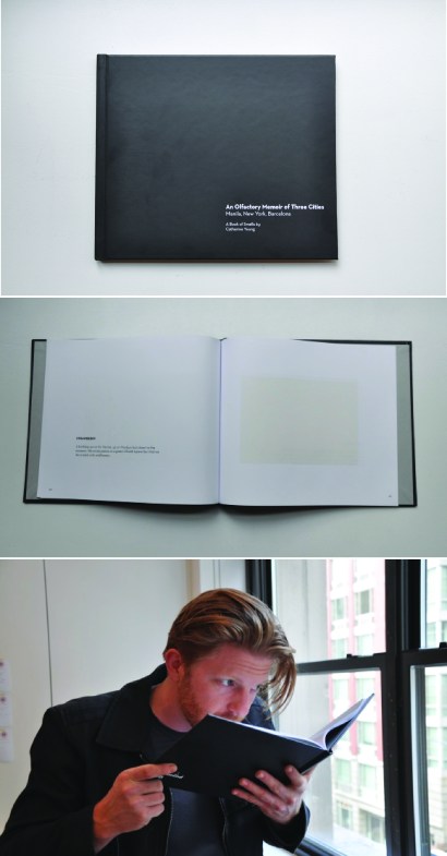 Olfactory Memoir is a book of smell memories of three cities I’ve lived in—Manila, New York, and Barcelona—where each spread of the book contains the written smell memory (of objects, places, and people) and the actual smell printed on the right. The smells are specially made through microencapsulation and printing. It tangibilizes the invisible—smell—through the narrative afforded by the form of a book, and also becomes a conversation piece when smelled by other people whose memories of the same smell are different from mine.