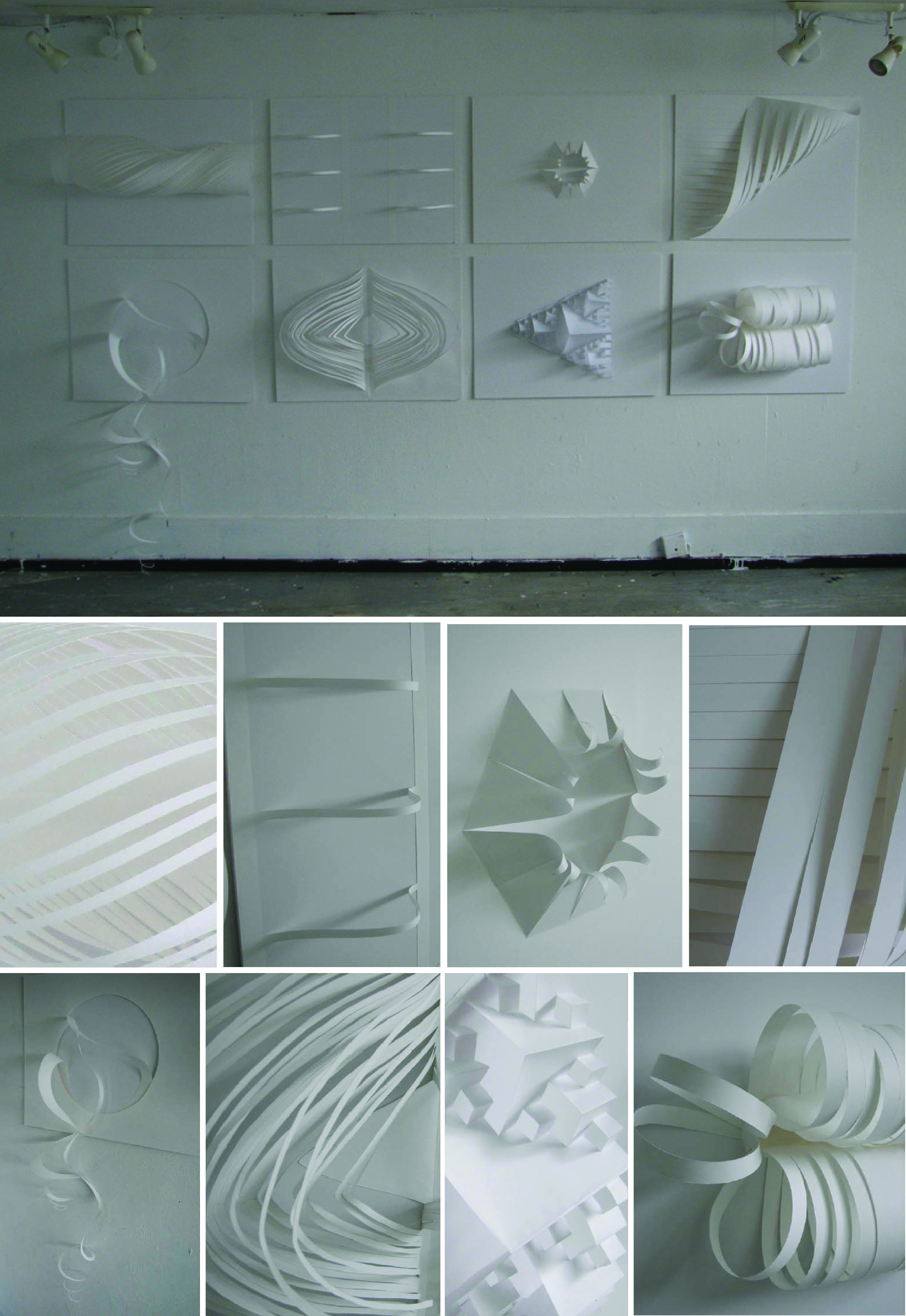 Elements is a series of eight white paper sculptures that depict the eight basic elements in nature: heaven, river, fire, thunder, wind, water, mountain and earth. Elements is an exploration of the forms of these abstractions, using paper engineering, origami and mathematics to fulfill these intentions.