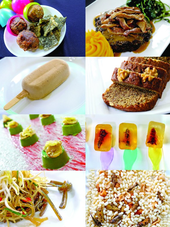 Future Feast (Manila, 2014) with various chefs. Clockwise from top right: By Erik Capaque and Claudette Dy—1. Salis-vermi Steak with Sweet Potato and Water Leaf Weed 2. Banana Vermi Loaf. By Nancy Reyes Lumen the Adobo Queen—3. Jello Insekto, 4. Jeepers Crispers! By Judy Lao—5. Sea Kelp with Bean Sprouts and Preserved Seaweed By Sau del Rosario 6. Tofu Moringa and Aloe Vera Panna Cotta with Banana, Candied Ginger, Peanut, and Acai Berry Sauce. By Ian Carandang—7. Cashew Nut Milk Ice Cream Bar. By Kyle Imao—8. Seaweed Tempura and Croquek.